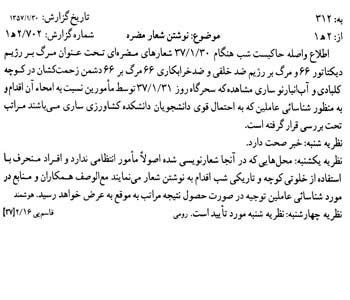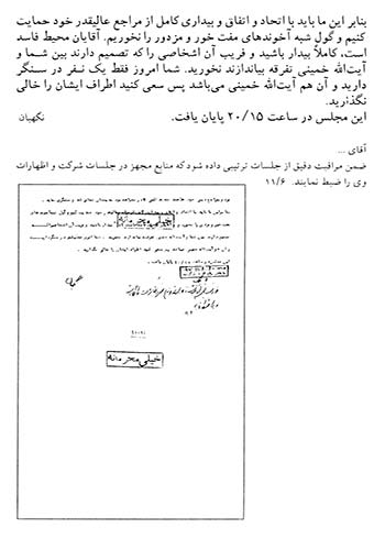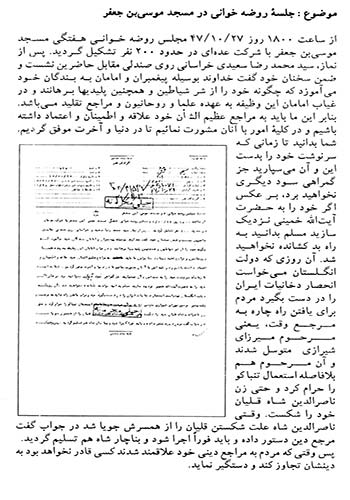 سند دیگر امروز اجتماع مردم در بهشت زهرا(س) مربوط به سال 1357 را نشان میدهد. لازم به یادآوری است که پس از کشتار مردم در 17 شهریور 1357، انقلابیون و خانوادههای شهدا روزهای پنجشنبه و جمعه را در بهشتزهرا(س) اجتماع کرده و به این ترتیب علیه رژیم پهلوی مبارزه میکردند. در بخشی از این سند آمده است: «همه هفته عصرهای پنج شنبه و جمعه تحت عنوان فاتحهخوانی در این محل اجتماع و با دست یازی به اعمال و اقدامات تحریکآمیز و برانگیختن احساسات عمومی مردم، علیه رژیم قانونی و مصالح عالیه کشور فعالیت دارند.»