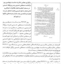 لازم است... قیام‌ها و تظاهرات مسلمین ایران را در شهرستان‌های مختلف با تاریخ و انگیزه آن ثبت نمایند تا مطالب اسلامی و نهضت روحانیت سرمشق جوامع و نسل‌های آینده شود. امام خمینی(قدس سره)، صحیفه امام، ج 3، ص 434.