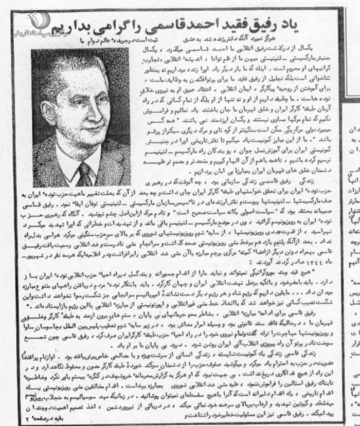 [3] احمد قاسمی از ابتدای تأسیس حزب توده ایران، به این تشکیلات پیوست. او در طول فعالیتهای خود، دو بار به زندان افتاد. در آذرماه سال 1329 به همراه 9 تن دیگر از اعضای کمیته مرکزی حزب توده از زندان گریخت و همچنان به مبارزات خود ادامه داد تا اینکه به همراه غلامحسین فروتن و عباس سغایی، سازمان مارکسیستی ـ لنینستی توفان را بهوجود آورد. قاسمی در 24 بهمن 1352 بر اثر سکته قلبی درگذشت. در اولین کنگره حزب توفان که در سال 1356 برگزار شد، به او لقب «صدر دائمی حزب» را اعطاء کردند. ر.ک: حزب کار ایران، «مرغان پرکشیده توفان»، نسخه الکترونیکی، بیتا، بیجا، ص 8.