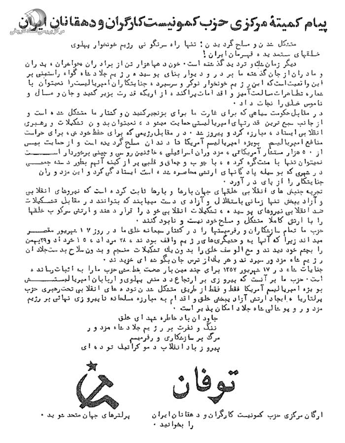[40] همان، «پیام کمیته مرکز حزب کمونیست کارگران و دهقانان ایران»، دوره چهارم، شماره 12 (ضمیمه)، شهریورماه 1357، ص 4.