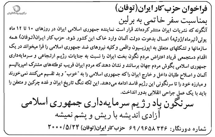 [54] همان، «فرخوان حزب کار ایران (توفان) به مناسبت سفر خاتمی به برلین»، دوره ششم، شماره 4، مردادماه 1379، ص 12.