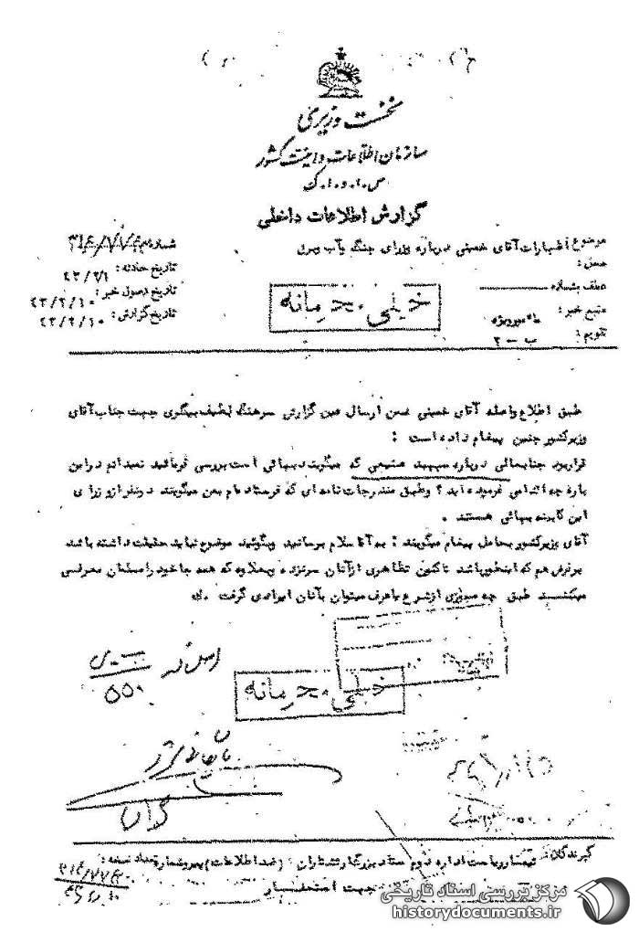 تیمسار ریاست اداره دوم ستاد بزرگ ارتشتاران(ضد اطلاعات) پیرو شماره: 7742 /314 – 10 /2 /43 جهت استحضار.