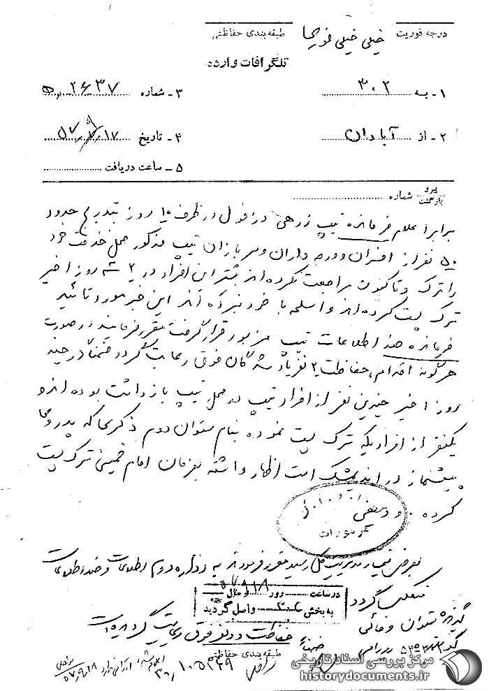 برابر اعلام فرمانده تیپ زرهی دزفول در ظرف 10 روز بهتدریج حدود 50 نفر از افسران و درجهداران و سربازان تیپ مذکور محل خدمت خود را ترک و تاکنون مراجعت نکردهاند. بیشتر این افراد در 2 سه روز اخیر ترک پست کردهاند و اسلحه با خود نبردهاند. این خبر مورد تأیید فرمانده ضد اطلاعات تیپ مزبور قرار گرفت. مقرر فرمایند در صورت هرگونه اقدام، حفاظت 2 نفر یادشدگان فوق رعایت گردد. ضمناً در چند روز اخیر چندین نفر از افراد تیپ در محل تیپ بازداشت بودهاند و یک نفر از افرادی که ترک پست نموده به نام ستوان دوم ذکری که پدر وی پیشنماز در اندیمشک است اظهار داشته به فرمان امام خمینی ترک پست کرده.