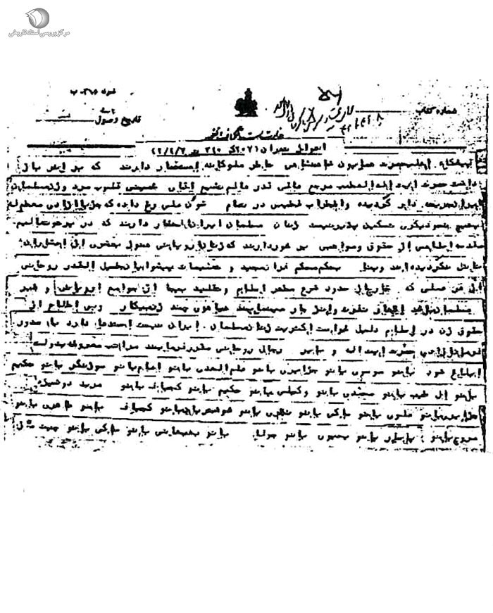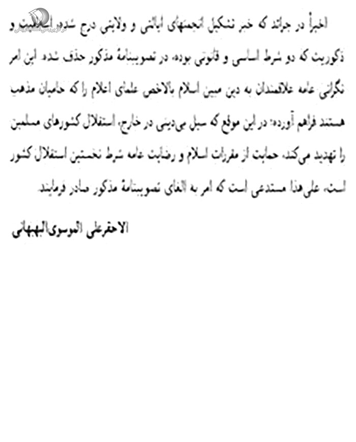 «اخیراً در جرائد که خبر تشکیل انجمنهای ایالتی و ولایتی درج شده، اسلامیت و ذکوریت که دو شرط اساسی و قانونی بوده، در تصویبنامهی مذکور حذف شده. این امر نگرانی عامه علاقمندان به دین مبین اسلام بالاخص علمای اعلام را که حامیان مذهب هستند فراهم آورده در این موقع که سیل بیدینی در خارج، استقلال کشورهای مسلمین را تهدید میکند، حمایت از مقررات اسلام و رضایت عامه شرط نخستین استقلال کشور است، علیهذا مستدعی است که امر به الغای تصویبنامهی مذکور صادر فرمایند.
