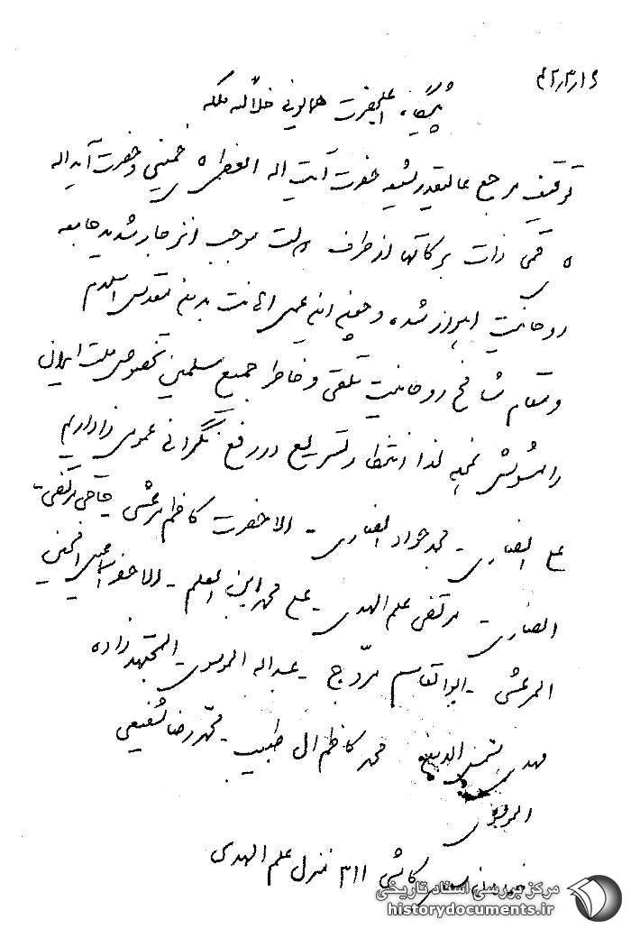 [2] . ذیل این تلگرام اسامی آیات و حجج اسلام زیر آمده است: اسدالله الحسنی [صدر هاشمی] ـ الاحقر عیسی طرفی ـ الاحقر محمدتقی مصدرالامور ـ عبدالرسول قائمی ـ محمدکاظم موسوی بهبهانی ـ الاحقر شیخ محمود سنابادی ـ آقا رضا [حجتی نجف آبادی] ـ الاحقر علیاکبر سلیمانی ـ الاحقر غلامحسین جمی ـ الاحقر سید حسین موسوی سلطانی.