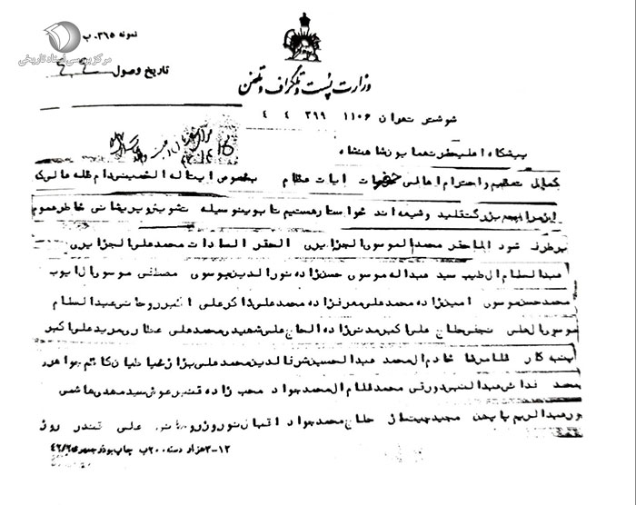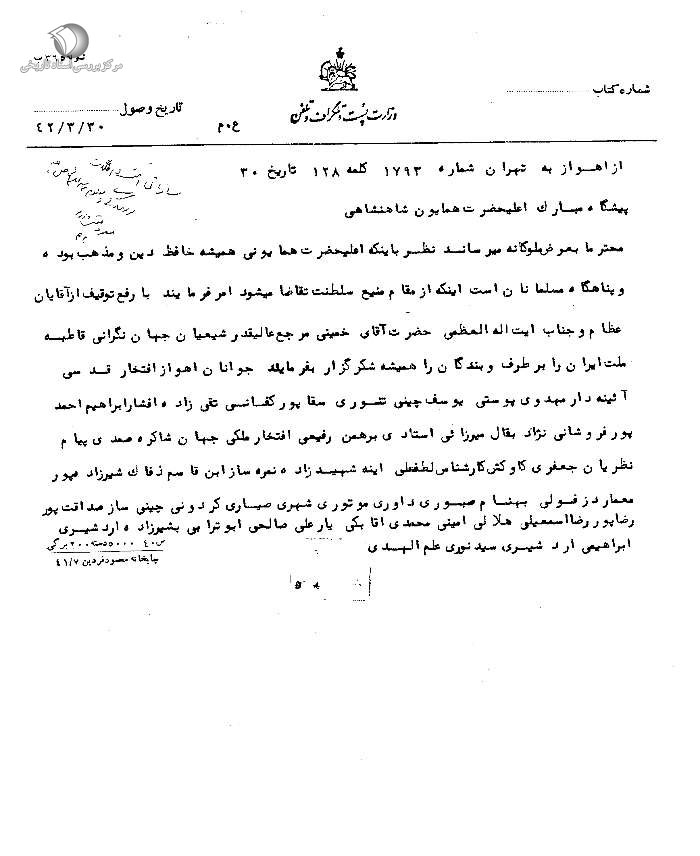 تلگراف علمای شوشتر به شاه جهت آزادی امام خمینی.