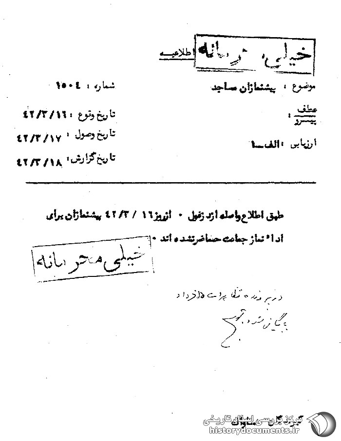 «پیشگاه مبارک اعلیحضرت شاهنشاه ایران ـ بهطوریکه خاطر مبارک استحضار دارد اقدام دولت نسبت به بازداشت حضرت آیتالله خمینی مدظله و سایر علمای اعلام، تأثر شدید و تأسف عمیق در کلیهی طبقات ایجاد کرده است. استدعا دارد امر و مقرر فرمائید به خاطر احترام افکار عمومی و رفع اضطراب و نگرانی، رفع توقیف از معظمله و دیگر رجال مذهبی بهعمل آید.»[21]