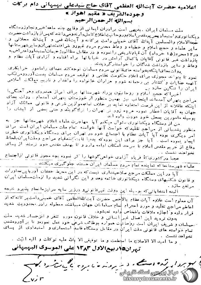 «توقیف مرجع عالی قدر شیعه حضرت آیتالله العظمی آقای خمینی و حضرت آیتالله [سیدحسن] قمی دامتت برکاتهما از طرف دولت موجب انزجار شدید جامعه روحانیت اهواز شده و چون این عمل اهانت به دین مقدس اسلام و مقام شامخ روحانیت تلقی و خاطر جمیع مسلمین به خصوص ملت ایران را مشوش نموده لذا انتظار تسریع در رفع نگرانی عمومی را داریم.»[14]