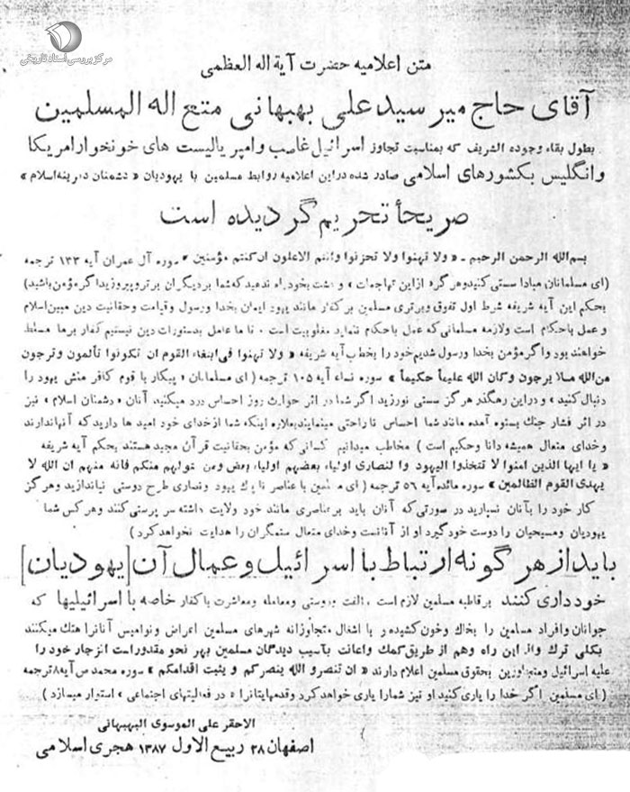 متن اعلامیه آیتاله العظمی میر سید علی بهبهانی درباره تحریم رابطه با یهود.