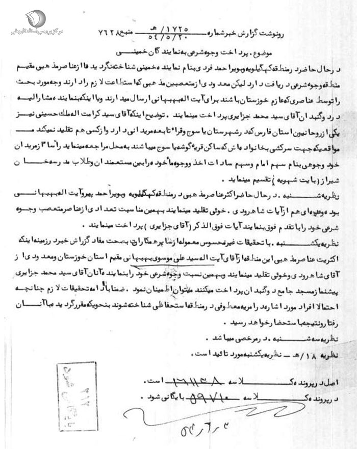 موضوع: پرداخت وجوه شرعی به نمایندگان خمینی.