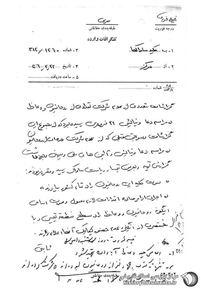 پس از اهدای تحیات و سلام مخصوص، مرقوم محترم حضرات آقایان که حاکی از عواطف کریمه نسبت به حقیر و قدردانی از جناب مستطاب ثقهالاسلام و المسلمین آقای خزعلی خطیب محترم- دامت افاضاته- بود موجب تشکر گردید. بحمدالله امسال اهالی محترم خوزستان- ایّدهمالله تعالی- از احساسات دینی و تعظیم شعائر مذهبی فروگذار ننموده و در آن مرکز حساس و محیط ارزنده به وظایف مذهبی خود قیام نمودند و به دستگاه جبار عملاً فهماندند که محیط کارگری در تعظیم شعائر دینی پیشقدم و در راه عظمت اسلام و استقلال مملکت اسلامی کوشا هستند و از اسرائیل و عمال منفور آن متنفر [ند] و در راه اهداف روحانیت که اهداف اسلام است از هیچگونه فعالیتی دریغ ندارند. باید علمای اعلام و خطبای عظام، ملت را عموماً و طبقه کارگر را خصوصاً، از خطر اجانب عموماً و خطر اسرائیل و عمّال اسرائیل خصوصاً برحذر دارند و از آنهایی که دست اجانب و خصوص اسرائیل را برای قبضه ذخایر کشور باز گذاشتهاند اظهار تنفر و برائت کنند. امروز روزی است که مسلمین باید اجتماعات مذهبی خود را هرقدر بیشتر و صفوف جماعات و سایر شعائر دینی را هرقدر فشردهتر کنند تا خائنین به اسلام و مملکت چشم طمع را از آنها ببُرند. باید علمای اعلام، رویّه کنارهگیری و گوشهنشینی را رها فرمایند و خطبای عظام حقایق را روشن به ملت گوشزد نمایند و آنها را به خطرات محتمله آگاه نمایند و ملت باید از علمای اعلام و مبلغین محترم پشتیبانی نمایند. رجای واثق دارم که پیروزی نهایی با طرفداران اسلام است و خداوند تعالی با ماست. از درگاه مقدسش عظمت اسلام و مسلمین را خواستار است.