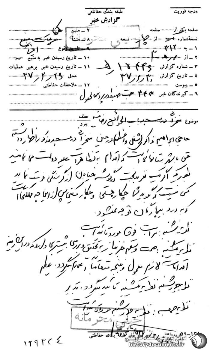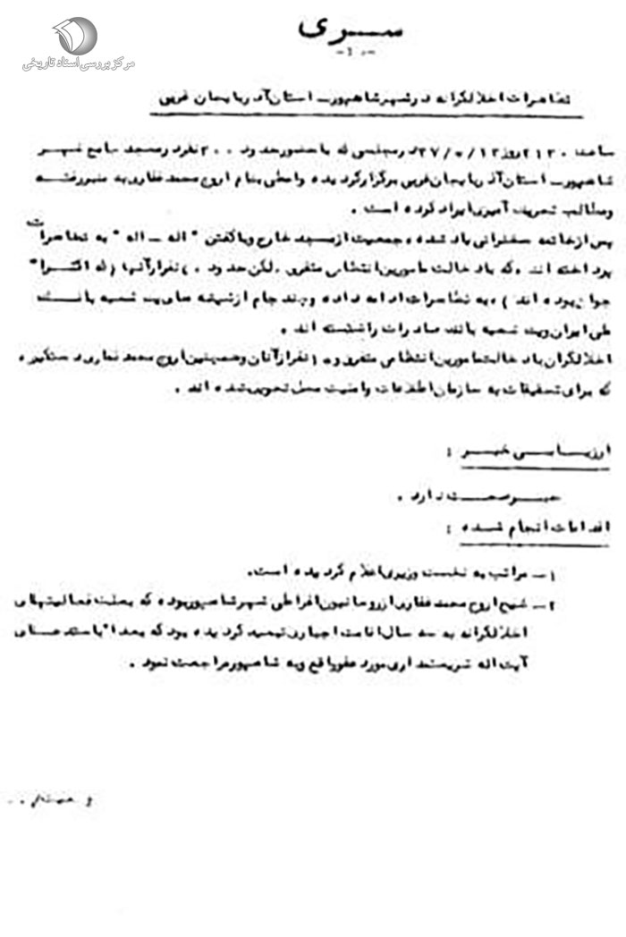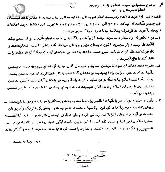 گزارش ساواک از سخنرانی آیتالله سید اصغر ناظمزاده در مسجد اعظم ارومیه در ماه مبارک رمضان 1357.