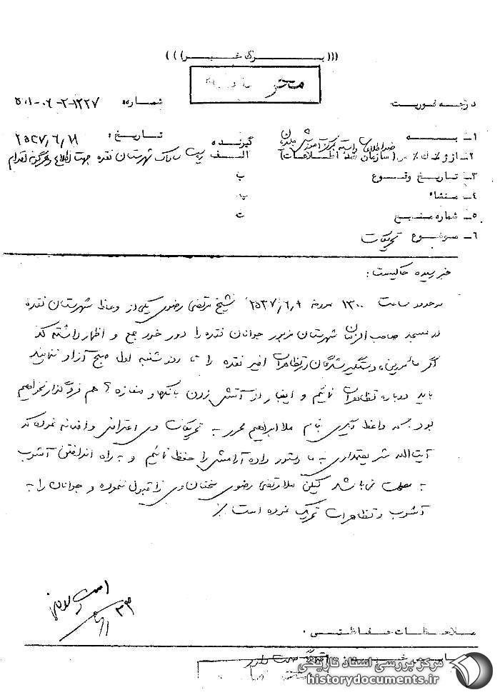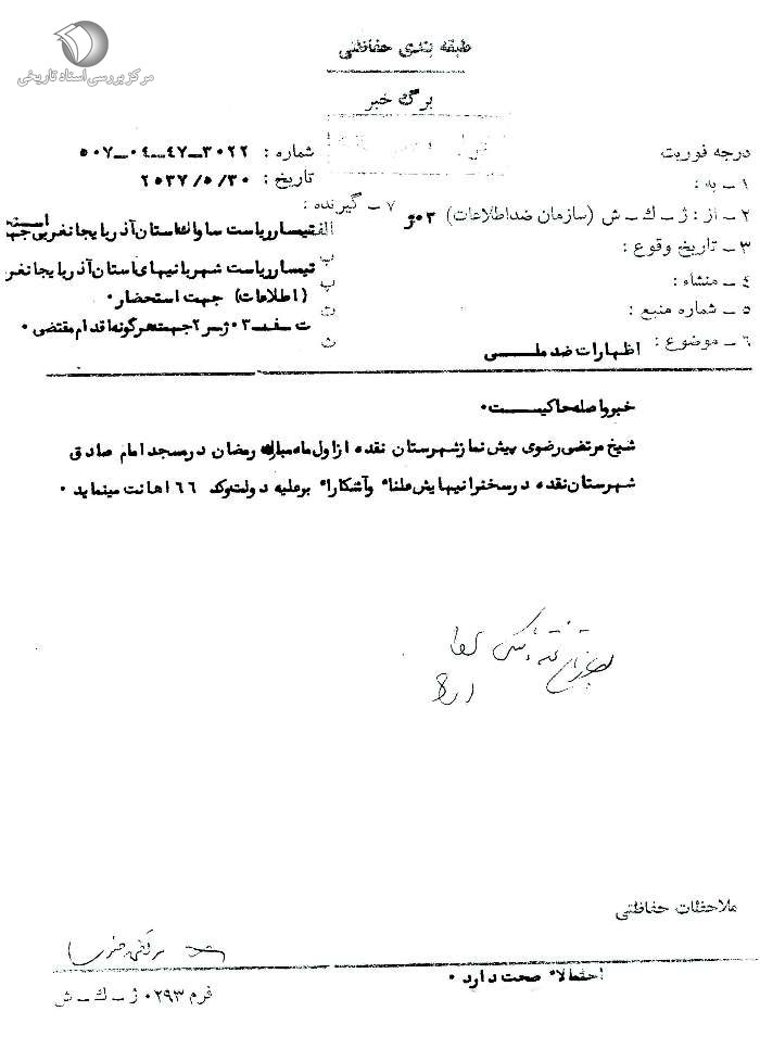 گزارش ساواک از علت اخراج آیتالله سید اصغر ناظمزاده از ارومیه در ماه مبارک رمضان 1357.