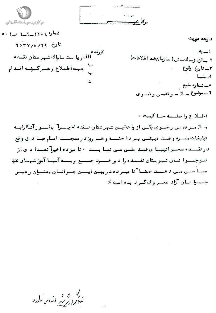 [17] . گزارش یکی از اسناد ساواک در مورد سخنرانیهای حجتالاسلام مرتضی رضوی در رمضان سال 1357 چنین است: «شیخ مرتضی رضوی پیشنماز شهرستان نقده از اول ماه مبارک رمضان در مسجد امام صادق شهرستان نقده در سخنرانیهایش علناً و آشکارا بر علیه دولت و کد 66 [شاه] اهانت مینماید.» (سند شماره 11، پیوست در همین مقاله).