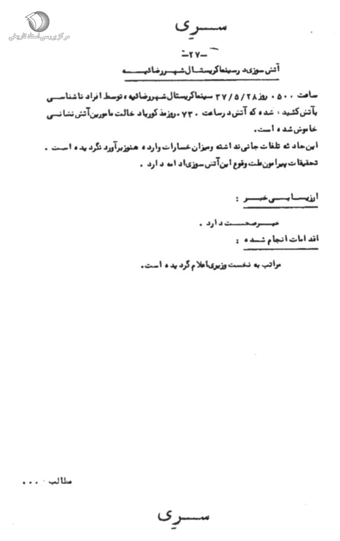 گزارش ساواک از آتش سوزی سینما کریستال ارومیه.