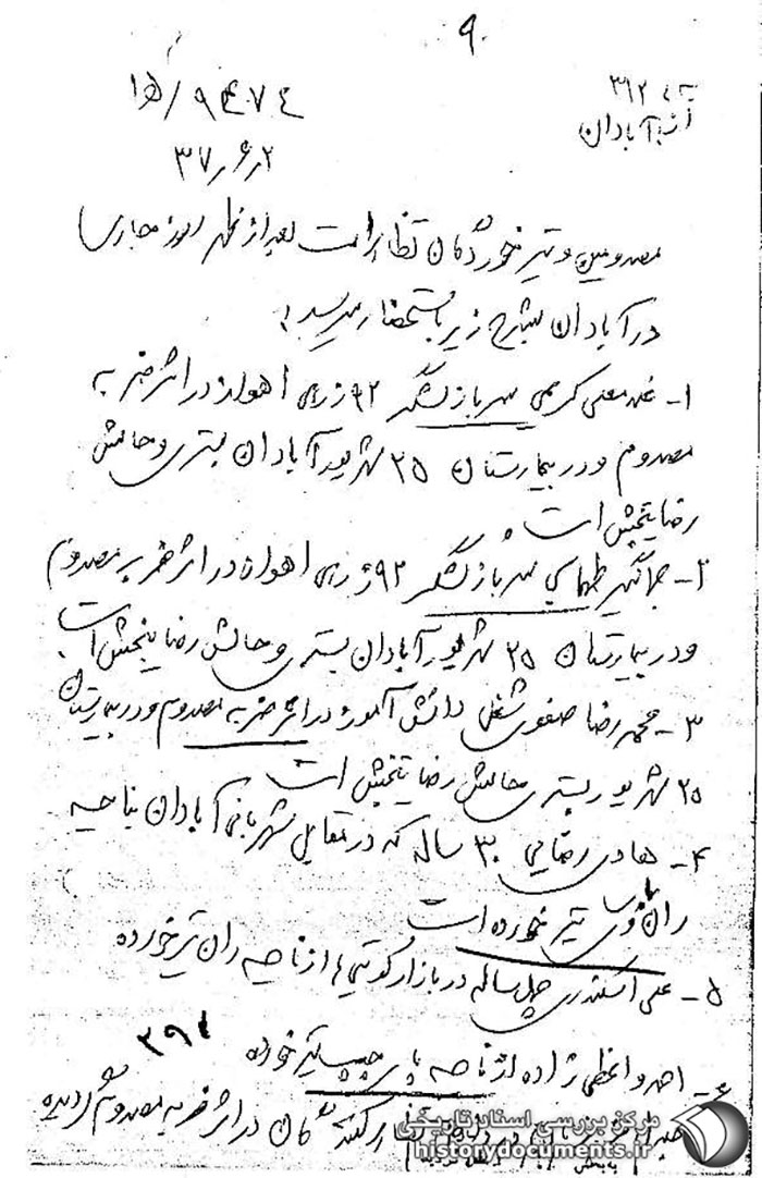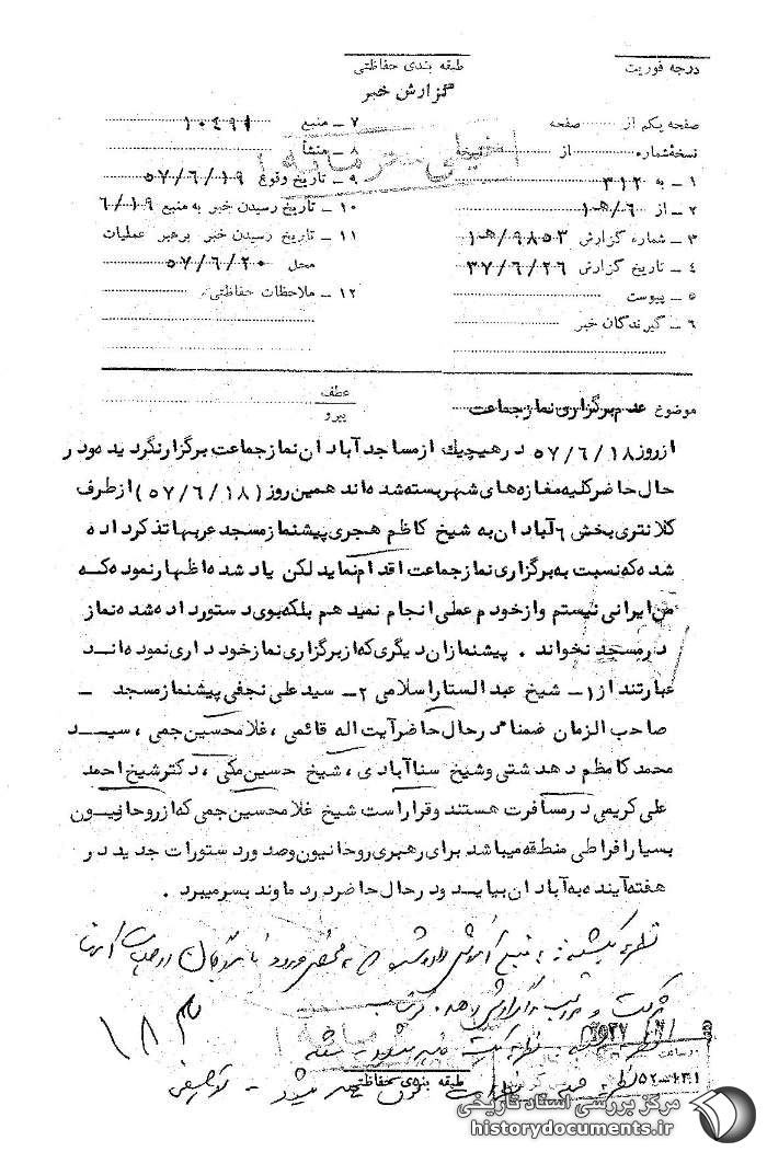 ت ـ شخصی به نام منوچهر فدائی، 35 ساله در اثر اصابت گلوله از ناحیه ران مصدوم و در بیمارستان شیروخورشید سرخ تحت عمل جراحی قرار گرفته و حالش رضایتبخش میباشد.»[20] در همین روز مراسمی در مسجد پیروزآباد برگزار شد و سخنران مجلس با اشاره به وجود فساد در کشور، خواهان برپایی حکومت اسلامی شد و اظهار داشت: «این مملکت، مملکت نیست. عدهای خیلی ثروتمند و عدهای دیگر فقیر هستند. در طبقات بالا هر شب مشروبخواری و قمار است. باید حکومت اسلامی در این مملکت بوجود آید. سینماها، قمارخانهها و رستورانها باید بسته شوند.» همان، توضیحات سند.