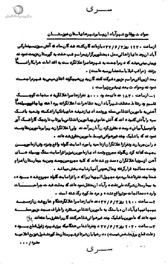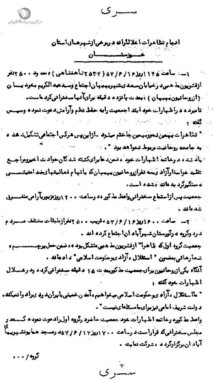 «خوزستان: الف ـ روز 19 /6 /57، چند نفر از روحانیون قشری شهر خرمشهر ضمن تشکیل جلسهای تصمیم گرفتهاند که مردم روز 20 /6 /57 بدون انجام تظاهرات، بازار و مغازههای شهر خرمشهر را تعطیل و در خانههای خود بمانند و نماز جماعت نیز برگزار نگردد.