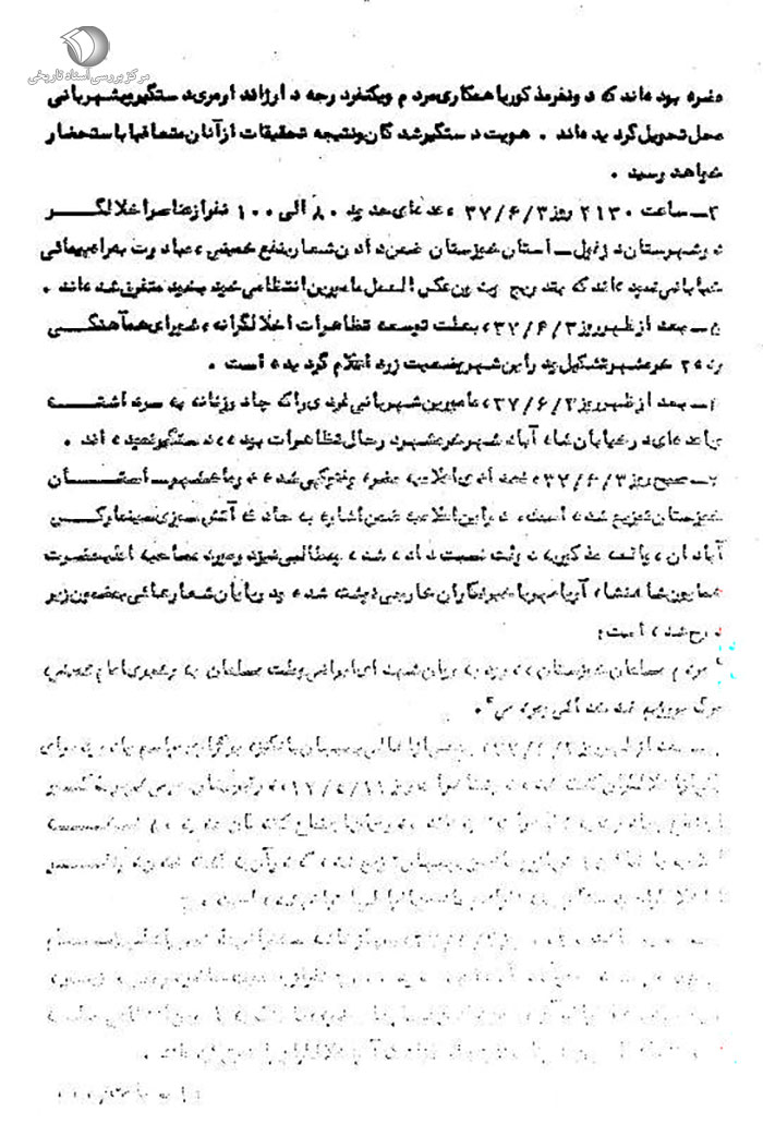 پ ـ از صبح روز 19 /6 /57 بازار و مغازههای خیابانهای شهر بهبهان تعطیل بوده است و روحانیون این شهر تصمیم گرفتهاند دو روز تعطیل عمومی اعلام و از مردم بخواهند که از هرگونه اقدامات اخلالگرانه پرهیز نمایند.