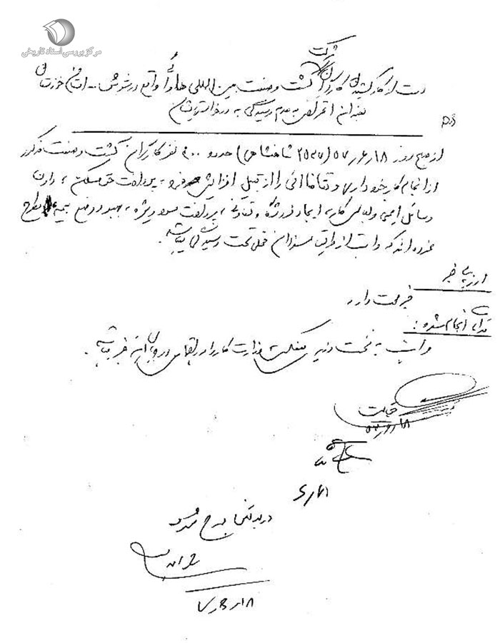 گزارش شهربانی شوشتر به دادگاه این شهر در خصوص حریق مغازه محمد حجتی.