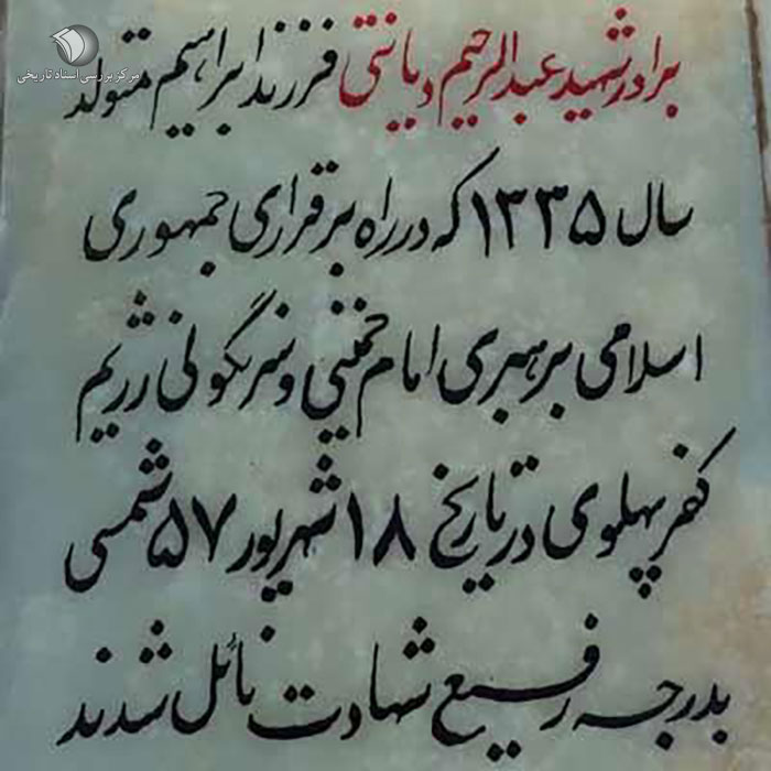 [52] . عبدالرحیم دیانتی 15 فروردین 1335 در دزفول به دنیا آمد. پدرش ابراهیم کفاش بود و مادرش خورشید نام داشت. تا پایان دوره متوسطه درس خواند و دیپلم گرفت. 18 شهریور 1357، در زادگاهش هنگام شرکت در تظاهرات علیه حکومت پهلوی بر اثر اصابت گلوله به شهادت رسید. مزار او در بهشت علی در دزفول واقع است. دو برادرش حبیب و عبدالحمید نیز از شهدای دفاع مقدس هستند. پایگاه اطلاعرسانی انقلاب اسلامی، https:/ /22bahman.ir/show.php?page=post&id=24094 به نقل از فرهنگ اعلام شهدا: استان خوزستان، ج 1، تنظیم: مرکز مطالعات و پژوهشهای بنیاد شهید و امور ایثارگران، تهران، نشر شاهد، 1395، ص 572.