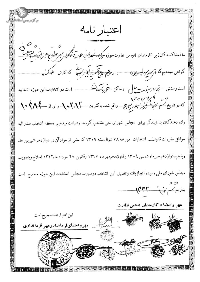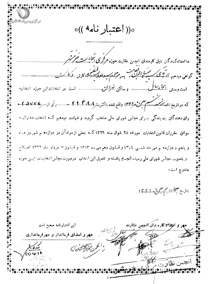 اعتبارنامه سید ضیاءالدین نقابت نماینده دوره هفدهم مجلس از خرمشهر.