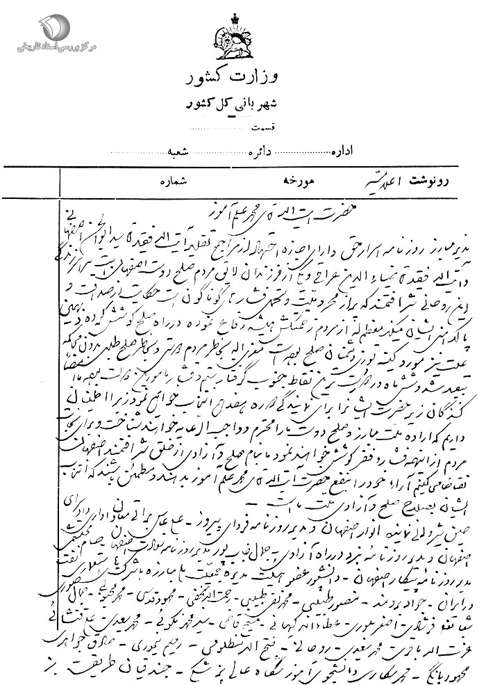 «اعلیحضرت همایون شاهنشاهی، خبر مسافرت غیرمترقبه اعلیحضرت همایونی موجب شگفتی و نگرانی فوقالعاده قاطبه اهالی مملکت و مردم پایتخت شده و هیئت رئیسه مجلس شورای ملی با استحضار آقایان نمایندگان به عرض میرساند که در وضع آشفته کنونی به هیچوجه مصلحت و صواب نمیداند که اعلیحضرت همایونی مبادرت به مسافرت فرمایند و ممکن است در تمام کشور تأثیرات عمیق و نامطلوب حاصل نماید. به این لحاظ از پیشگاه همایونی استدعا میشود که قطعاً در این مورد تجدیدنظر فرموده و تصمیم به مسافرت را به موقع دیگری در سال آینده تبدیل فرمایند.»[89]