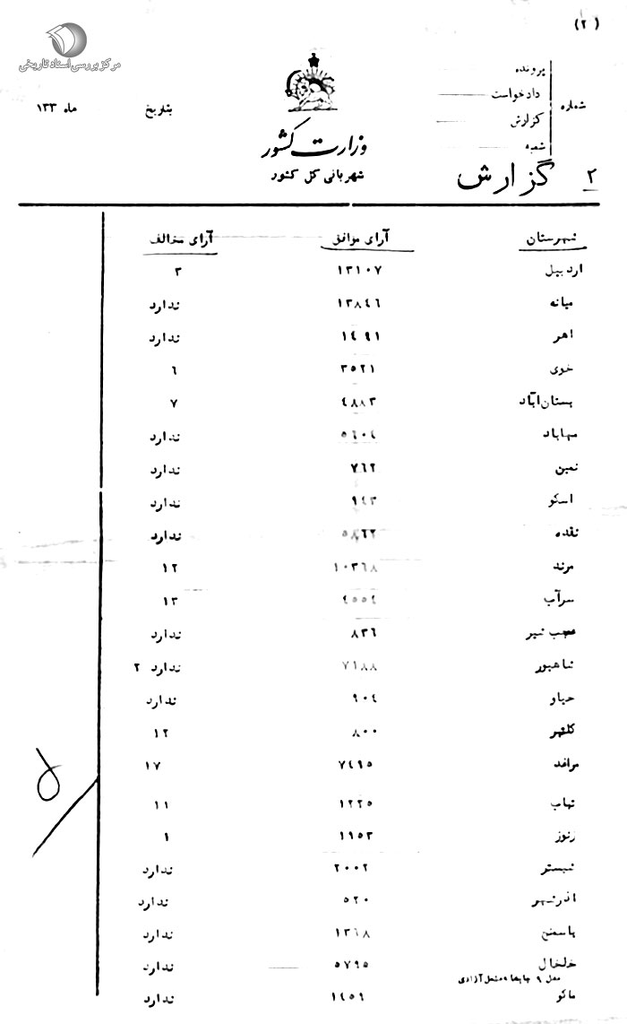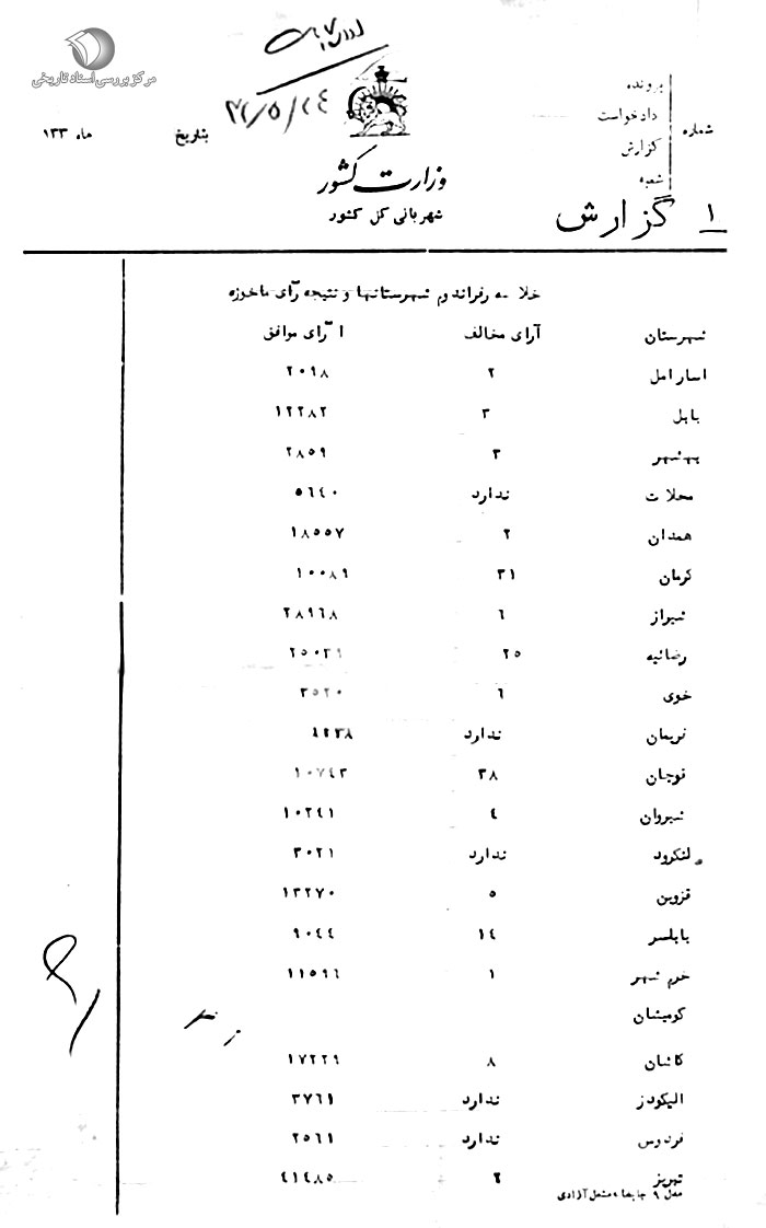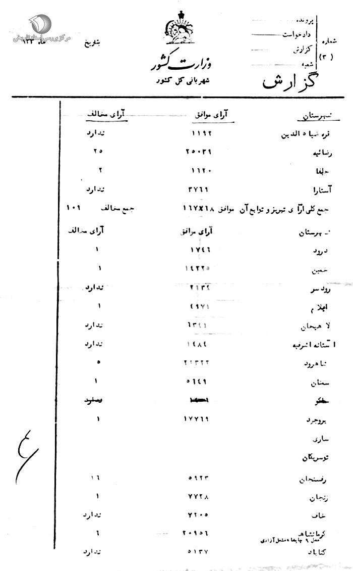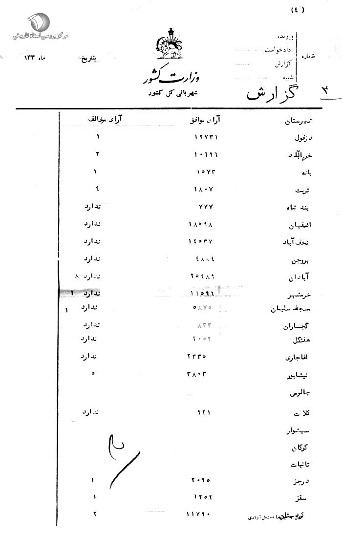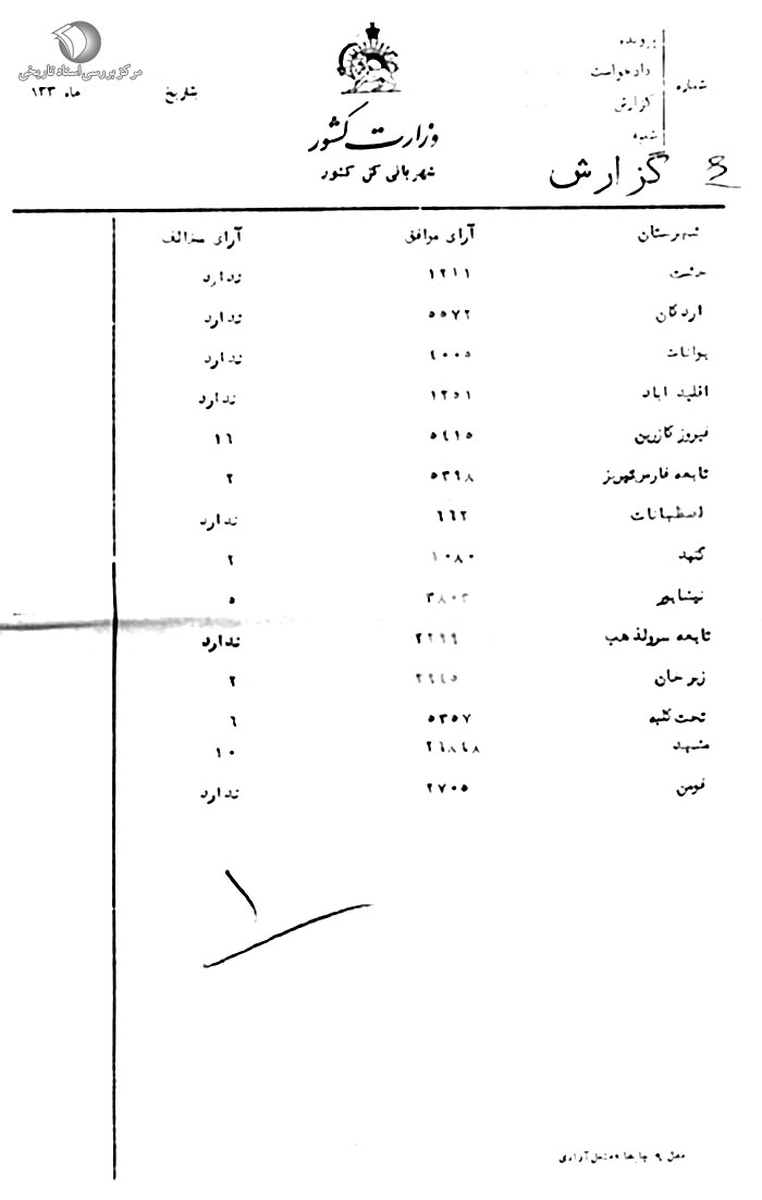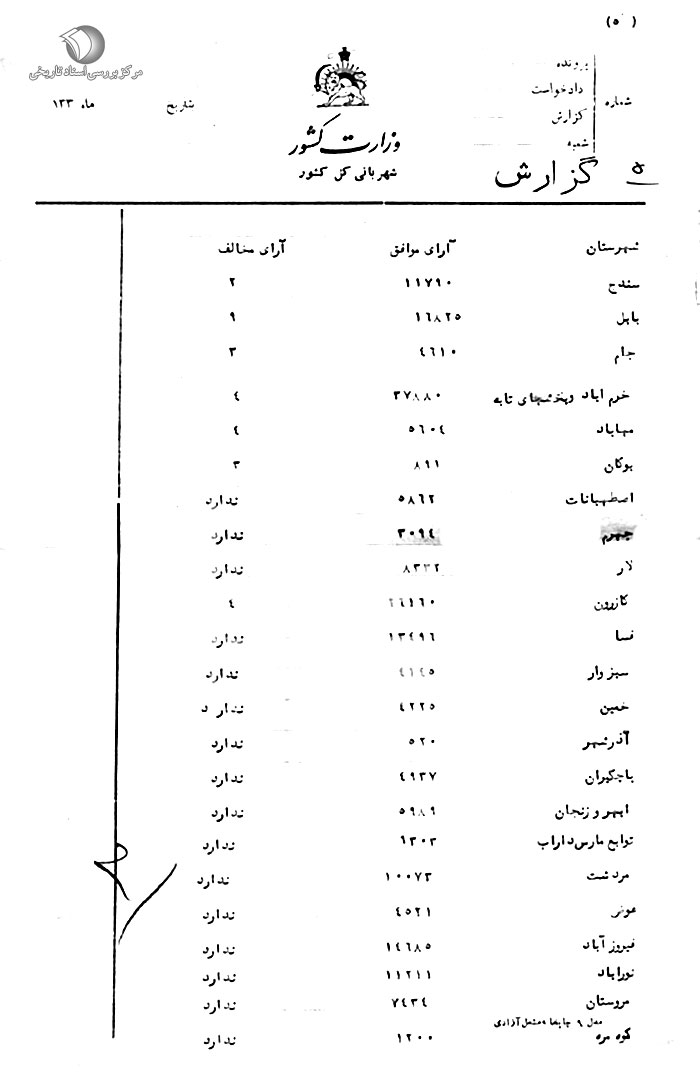 گزارش شهربانی کل کشور از برگزاری رفراندم ابقا یا انحلال مجلس دوره هفدهم شورای ملی در شهرستانها.