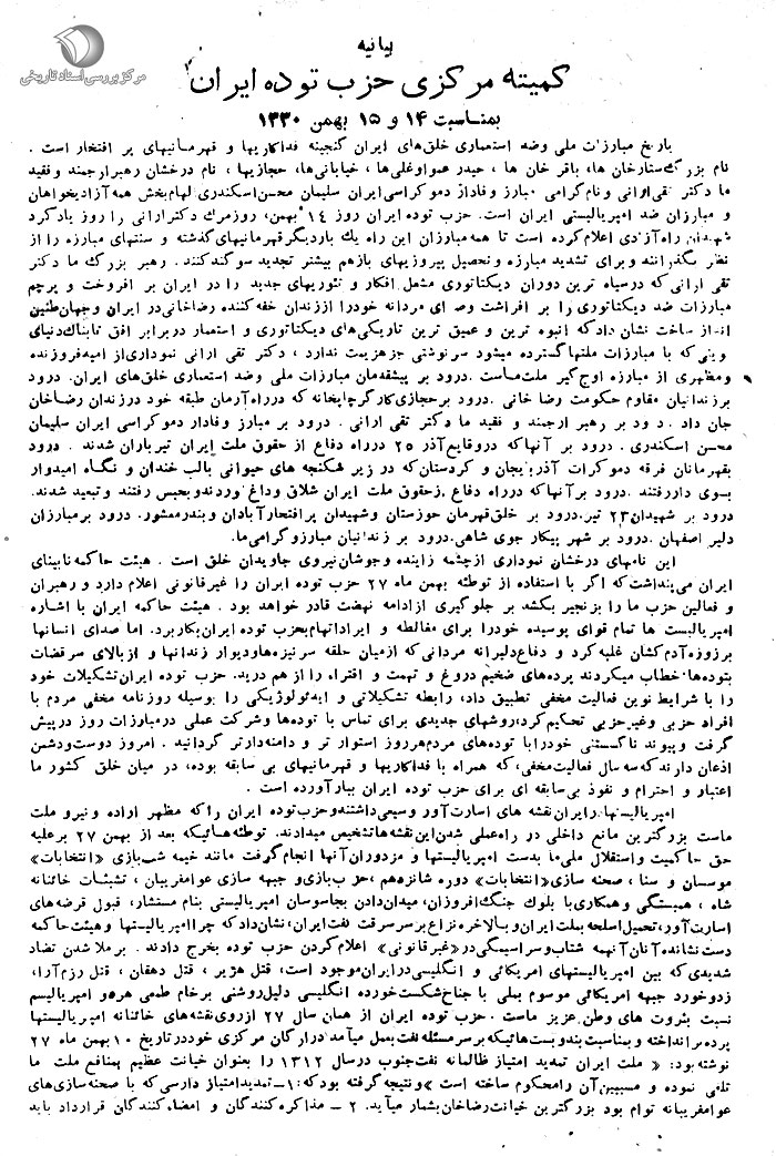 بیانیه حزب توده مبنی بر تشویق مردم به مبارزه با جبهه غرب و تأکید بر مداخله دولت در انتخابات مجلس دوره هفدهم. ص 1.