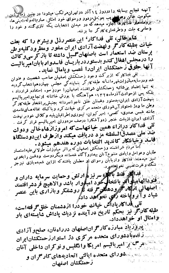 بیانیه حزب توده مبنی بر معرفی تقی فداکار کاندیدای نمایندگی مجلس دوره هفدهم مجلس از سوی دربار برای اصفهان. ص 1.
