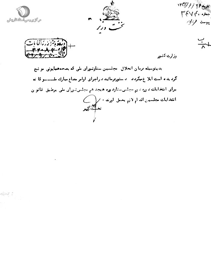 بخشنامه وزارت کشور به فرمانداریها و بخشداریها درباره اجرای تصویبنامه هیئت وزیران راجع به مراجعه به آراء عمومی درباره ابقا یا انحلال مجلس. ص 1.