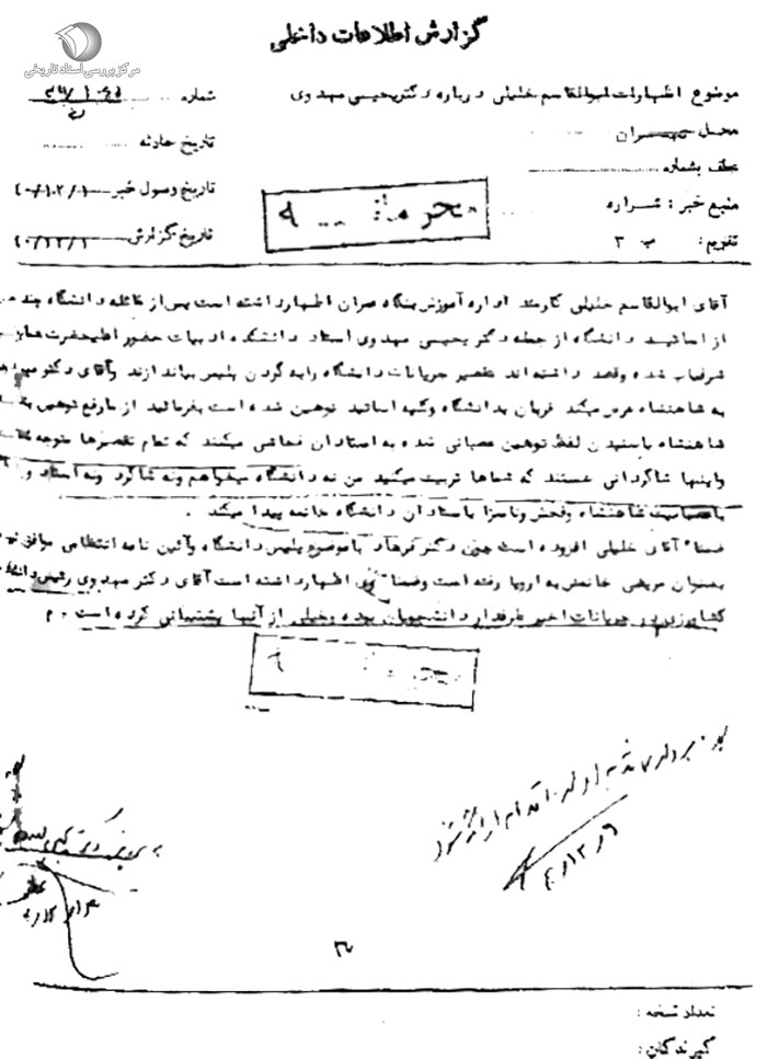 ضمنا آقاى خلیلى افزوده است چون دکتر فرهاد با موضوع پلیس دانشگاه و آییننامه انتظامى موافق نبوده به عنوان مریضى خانمش به اروپا رفته است و ضمناً وى اظهار داشته است آقاى دکتر مهدوى رئیس دانشکده کشاورزى در جریانات اخیر طرفدار دانشجویان بوده و خیلى از آنها پشتیبانى کرده است.