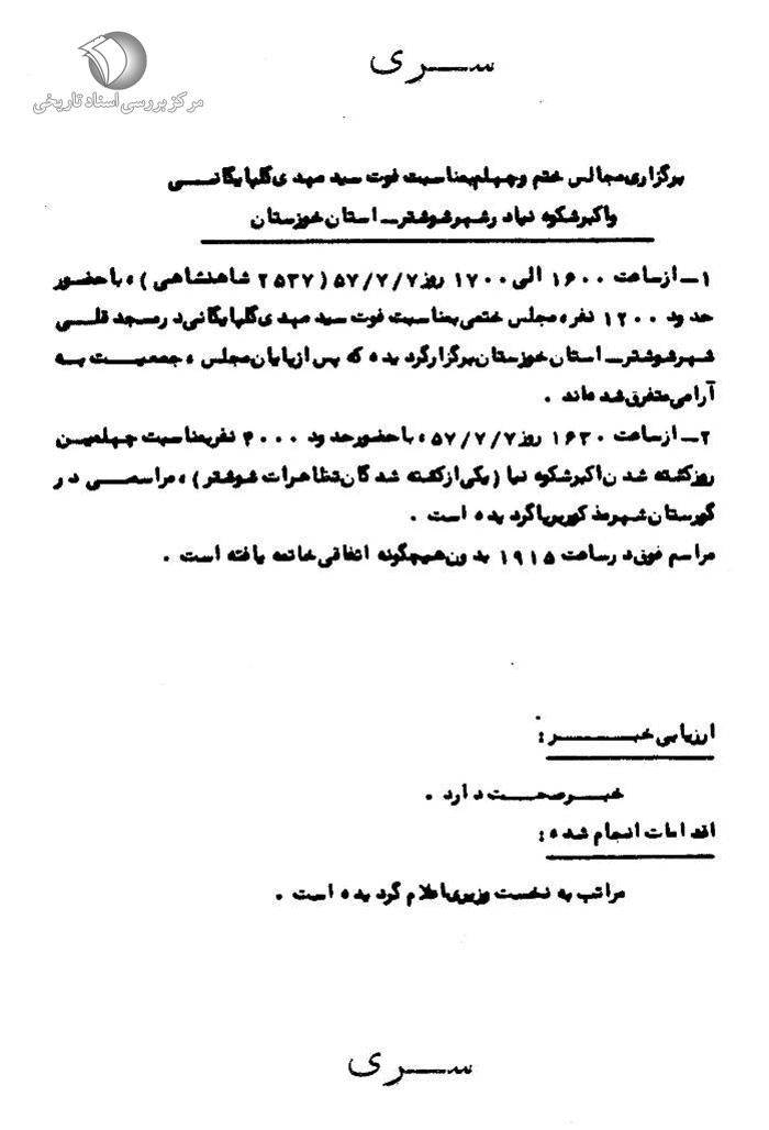 در شوشتر نیز «از ساعت 1600 الی 1700 روز 7 /7 /57 (2537 شاهنشاهی)، با حضور حدود 1200 نفر، مجلس ختمی به مناسبت فوت سیدمهدی گلپایگانی در مسجد قلی شهر شوشتر ـ استان خوزستان ـ برگزار گردیده که پس از پایان مجلس، جمعیت به آرامی متفرق شدهاند.»[14] همچنین «از ساعت 16:30 روز 7 /7 /57، با حضور حدود 4000 نفر به مناسبت چهلمین روز کشته شدن اکبر شکوهنیا (یکی از کشتهشدگان [شهدای] تظاهرات شوشتر)، مراسمی در گورستان شهر مذکور برپا گردیده است. مراسم فوق در ساعت 19:15 بدون هیچگونه اتفاقی خاتمه یافته است.»[15]