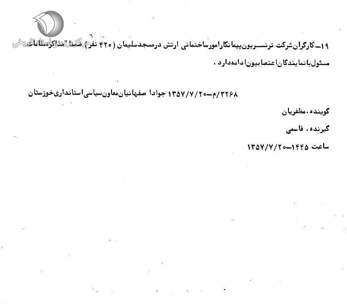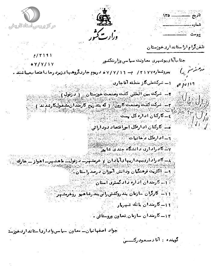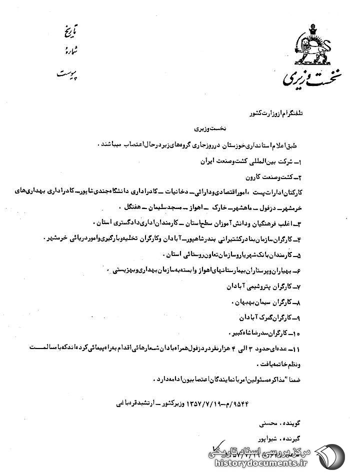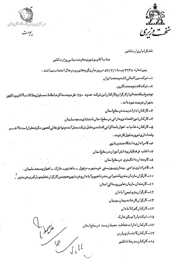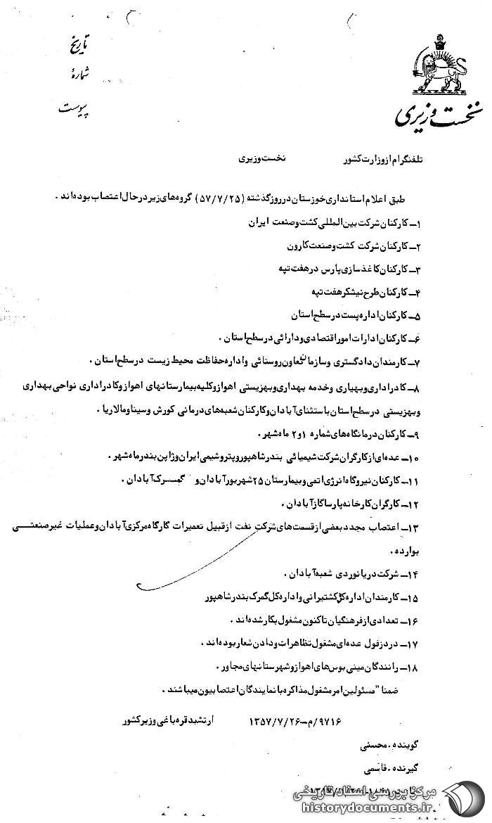 [78]. «1ـ کارکنان شرکت بینالمللی کشت و صنعت ایران. 2ـ کارکنان شرکت کشت و صنعت کارون. 3ـ کارکنان کاغذ سازی پارس در هفت تپه. 4ـ کارکنان طرح نیشکر هفت تپه. 5ـ کارکنان اداره پست در سطح استان. 6ـ کارکنان ادارات امور اقتصادی و دارایی در سطح استان. 7ـ کارمندان دادگستری و سازمان تعاون روستایی و اداره حفاظت محیط زیست در سطح استان. 8ـ کادر اداری و بهیاری و خدمه بهداری و بهزیستی اهواز و کلیه بیمارستانهای اهواز و کادر اداری نواحی بهداری و بهزیستی در سطح استان به استثنای آبادان و کارکنان شعبههای درمانی کوروش و سینا و مالاریا. 9ـ کارکنان درمانگاههای شماره 1 و 2 ماهشهر. 10ـ عدهای از کارگران شرکت شیمیایی بندر شاهپور و پتروشیمی ایران و ژاپن بندرماهشهر. 11ـ کارکنان نیروگاه انرژی اتمی و بیمارستان 25 شهریور آبادان و گمرک آبادان. 12ـ کارگران کارخانه پارساگاز آبادان. 13ـ اعتصاب مجدد بعضی از قسمتهای شرکت نفت از قبیل تعمیرات کارگاه مرکزی آبادان و عملیات غیرصنعتی بوارده. 14ـ شرکت دریانوردی شعبه آبادان. 15ـ کارمندان اداره کل کشتیرانی و اداره کل گمرک بندرشاهپور. 16ـ تعدادی از فرهنگیان تاکنون مشغول بکار شدهاند. 17ـ در دزفول عدهای مشغول تظاهرات و دادن شعار بودهاند. 18ـ رانندگان مینیبوسهای اهواز و شهرستانهای مجاور.» اسناد پایانی.