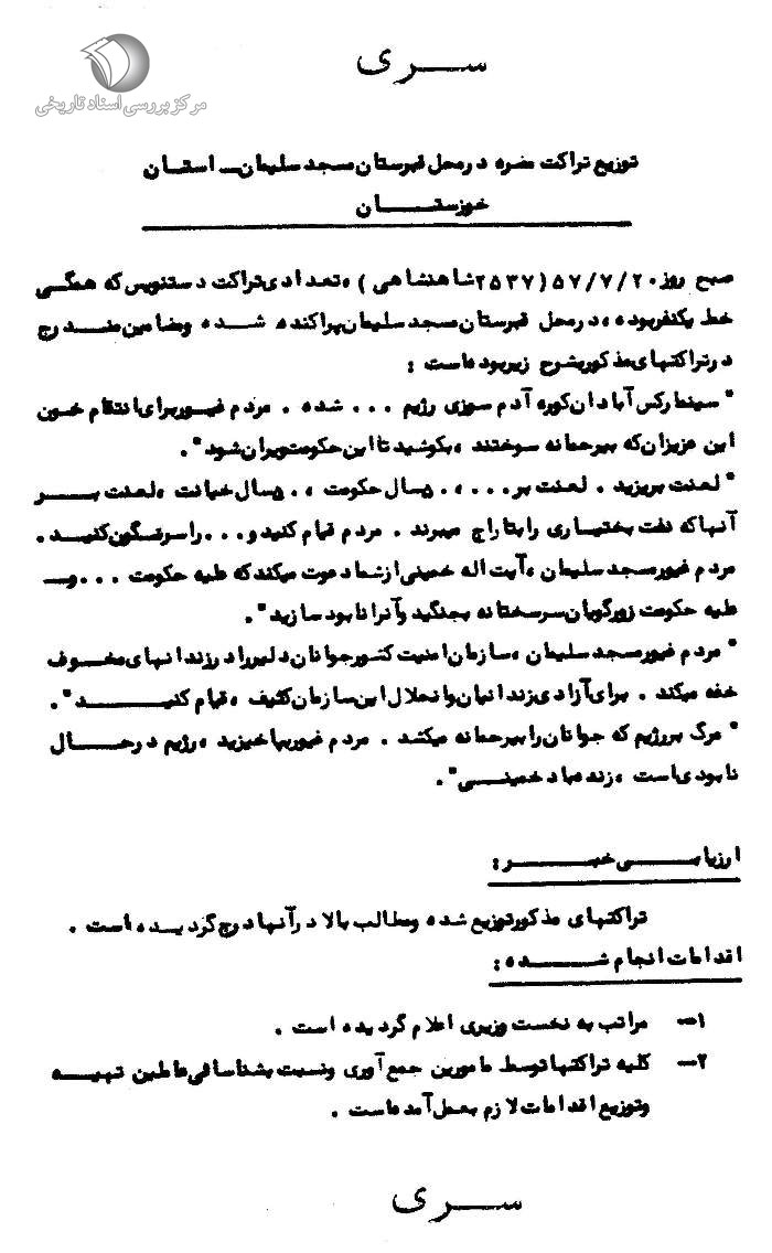 صبح روز 20 /7 /57 تعدادی تراکت دستنویس که همگی به خط یکنفر بود، در محل قبرستان مسجدسلیمان پراکنده شده بود، ساواک در گزارشی ضمن اشاره به این موضوع محتوای این تراکتها را به شرح زیر گزارش داد: «سینما رکس آبادان کوره آدم سوزی رژیم... شده. مردم غیور! برای انتقام خون این عزیزان که بیرحمانه سوختند، بکوشید تا این حکومت ویران شود.» ... «مردم غیور مسجد سلیمان! سازمان امنیت کشور، جوانان دلیر را در زندانهای مخوف خفه میکند. برای آزادی زندانیان و انحلال این سازمان کثیف، قیام کنید.» «مرگ بر رژیم که جوانان را بیرحمانه میکشد. مردم غیور بپاخیزید. رژیم در حال نابودی است. زنده باد خمینی.»[42] در گزارشی در مورد وضعیت شهر شوش نیز به تظاهرات فرهنگیان اشاره شده است.[43]