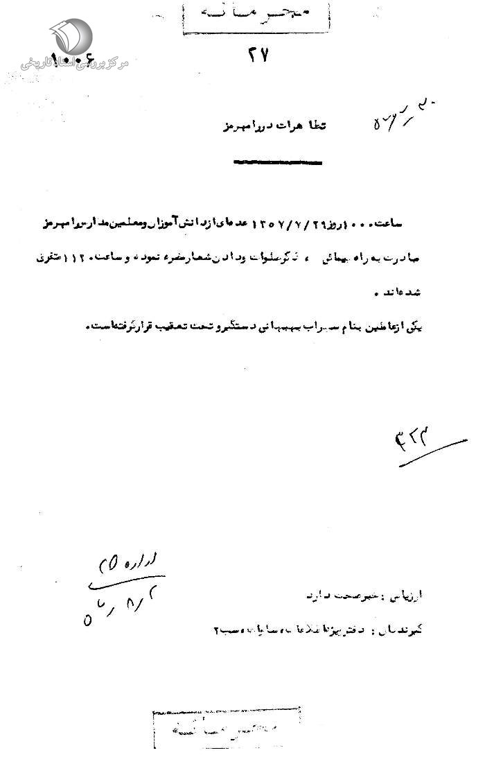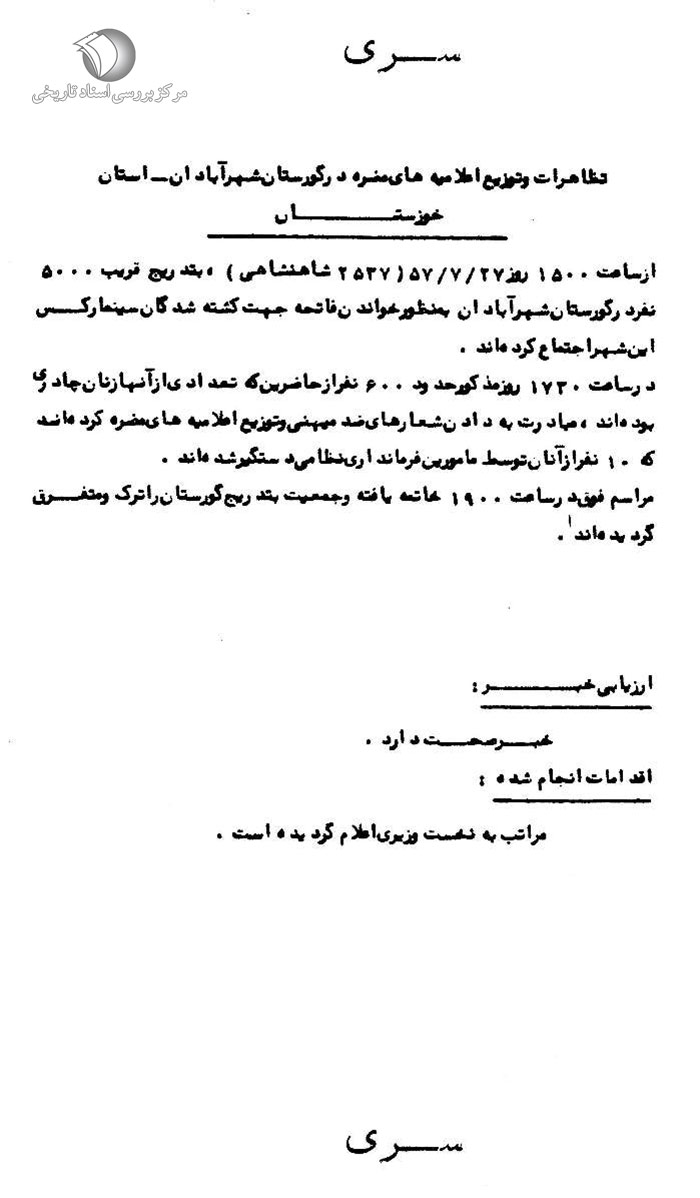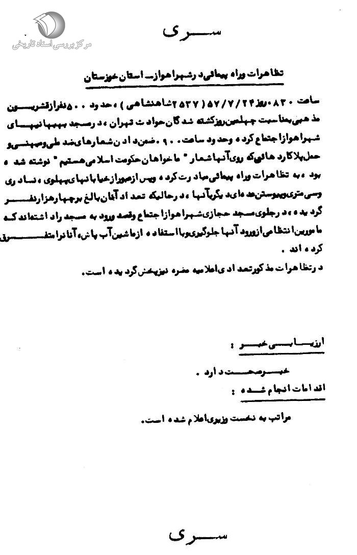 [84]. ساواک در مورد اوضاع شهر دزفول در این روز نوشت: «1ـ از ساعت 15:30 روز 27 /7 /57 (2537 شاهنشاهی)، مراسمی به مناسبت سومین روز کشتهشدگان تظاهرات اخلالگرانه روز 24 /7 /57 شهر دزفول ـ استان خوزستان (که مشروح آن قبلاً به استحضار رسیده است)، با شرکت عدهای حدود 30000 نفر در گورستان معصومآباد شهر مذکور برگزار گردیده است. در این مراسم، شخصی به نام شیخ احمد نظری به مدت یک ساعت برای حاضرین سخنرانی کرد و ضمن اهانت به مقامات عالیه مملکتی و محکوم نمودن ساواک، اظهار داشت: «هر کس در نام و شهرتش کلمه شاه وجود دارد، باید آن را تغییر دهد.» نامبرده اضافه کرده، «واقعه شهر کرمان به دست ساواک صورت گرفته.» افراد فوقالذکر در ساعت 1800 روز مذکور از گورستان خارج و به طرف شهر حرکت کردهاند و در خیابانهای شهر به دادن شعارهایی به نفع روحالله خمینی و شعارهایی به مضمون زیر: «ارتش تو انتخاب کن، جبهه حسین را یا جبهه یزید را؛ ارتش تو بیگناهی اسیر دست شاهی؛ تو ای پلیس بیسواد که کشتهای عزیز ما برای شاه بیوفا؛ شهیدان بدانید برادران دینی تا انتقام نگیریم آرام نمینشینیم» مبادرت کردهاند. ضمناً واعظ مذکور در میان جمعیت مخفی و حین خروج افراد از گورستان، متواری شده است. تظاهرکنندگان فوقالذکر در ساعت 19:30 روز مزبور بهتدریج متفرق گردیدهاند. 2ـ ساعت 2100 روز 27 /7 /57، عدهای حدود 200 نفر در مسجد آقا حبیب شهر دزفول به عنوان برگزاری «شام غریبان» جهت کشتهشدگان تظاهرات اخیر شهر دزفول اجتماع و در ساعت 2300 از مسجد خارج و بدون انجام تظاهراتی متفرق گردیدهاند.» انقلاب اسلامی به روایت اسناد ساواک، همان، ج 13، ص 618.