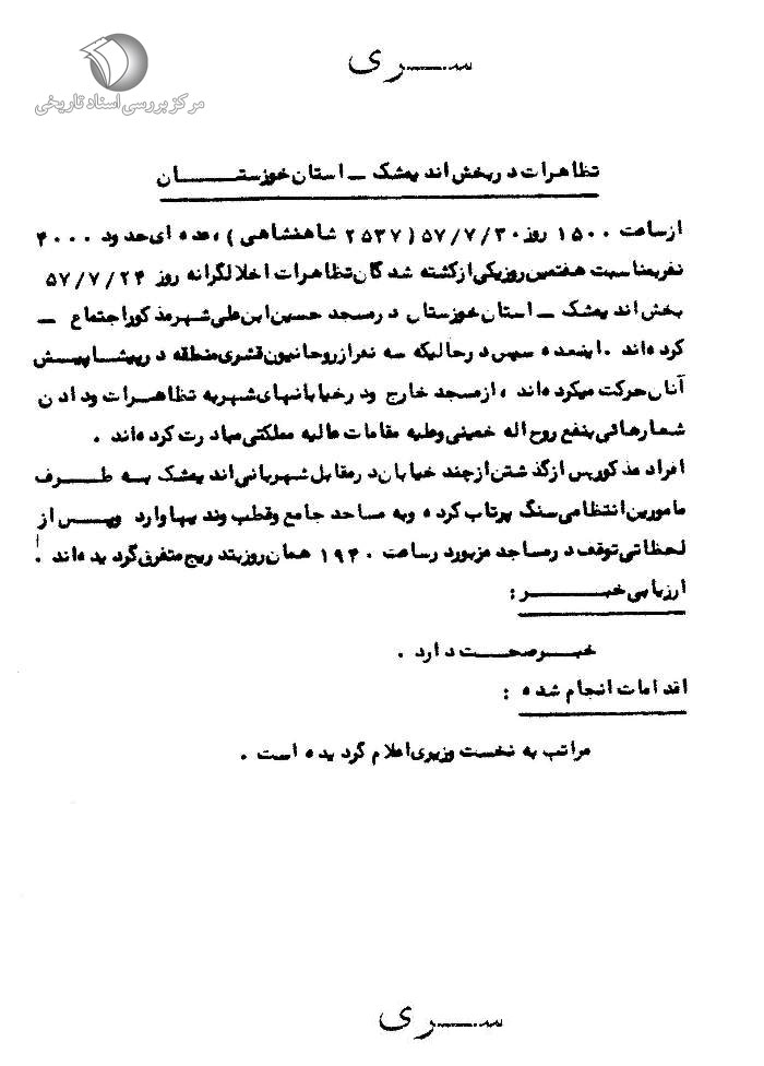 اسناد ساواک از تظاهرات گسترده در روزهای 20 و 21 مهر 57 در خوزستان حکایت دارند.[44]