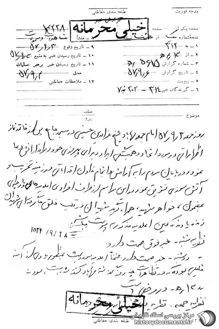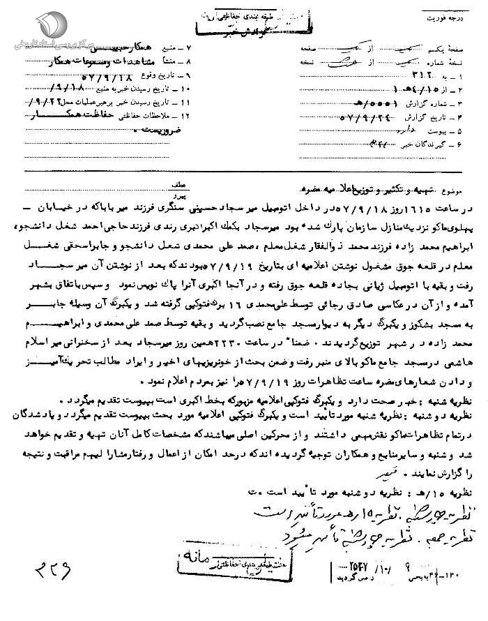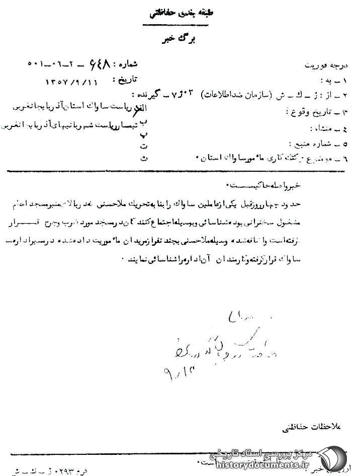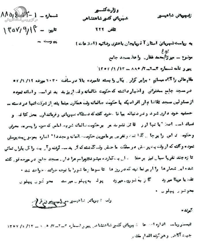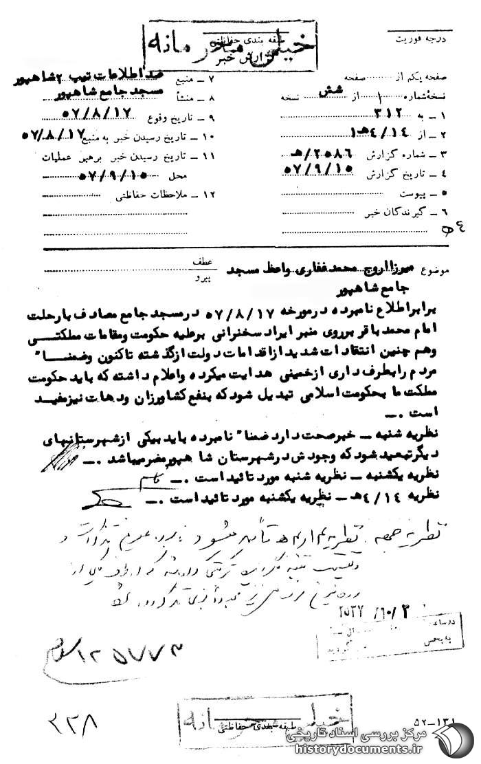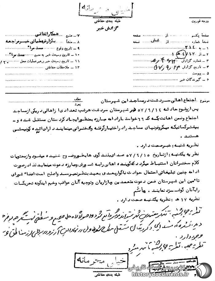[47]. سند شماره 24، پیوست در همین مقاله. دو روز پس از ایراد این سخنرانی، صبح روز 14 آذر 1357، یکی از مأموران شهربانی ارومیه موقع خروج از منزل هدف حمله چهار نفر ناشناس قرار گرفت و حال وی وخیم گزارش شد. طبق گزارش اسناد وقوع چنین حوادثی سبب تضعیف روحیه پرسنل گردید. همچنین در همین سند آمده است که برخی از «روحانیون مخالف و عناصر افراطی» عدهای را مأمور شناسایی و تعیین آدرس محل سکونت مأموران آگاهی و ساواک نمودند تا در موقعیت مناسبی به اقداماتی در مورد آنان دست بزنند. (مساجد استان آذربایجان غربی به روایت اسناد ساواک، همان، ج 2، ص 134).
