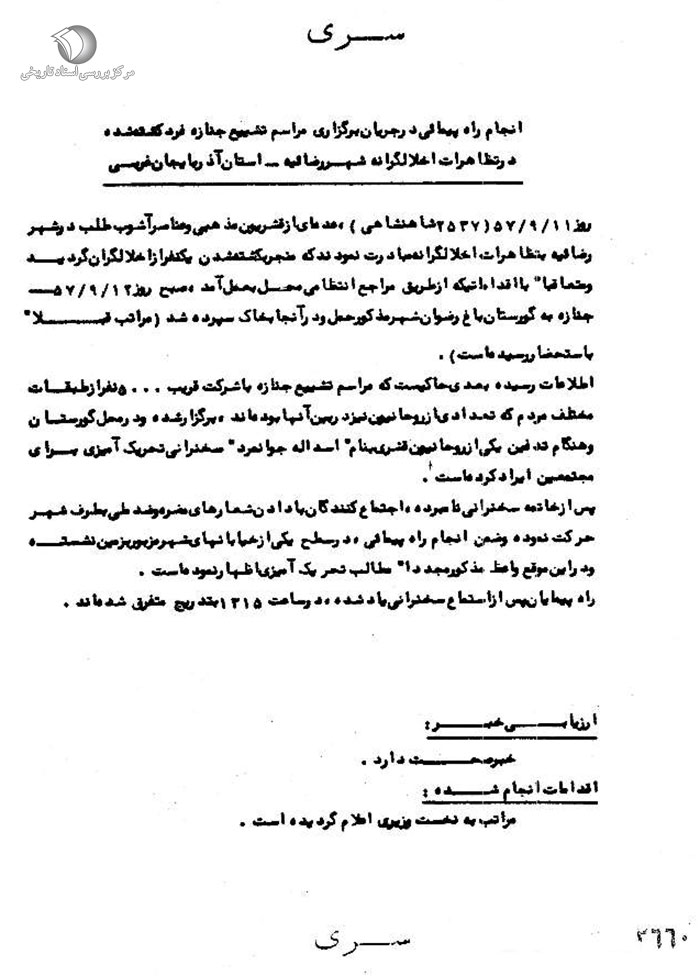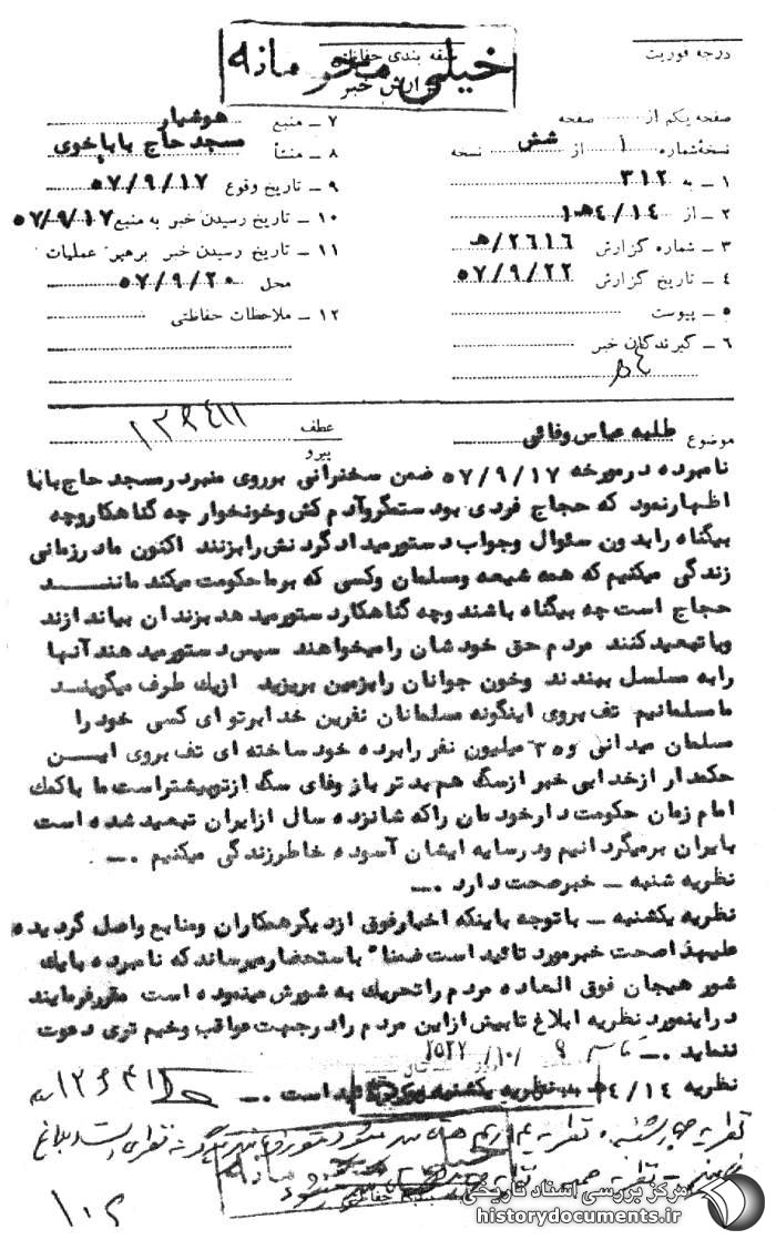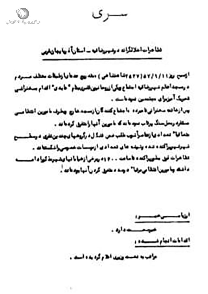 [6]. در اسناد ساواک در مورد حادثه مشهد آمده است: «ساعت 1700 روز 29 /8 /57 (2537 شاهنشاهی) پس از برگزاری مراسم ختم یکی از کشتهشدگان حوادث اخیر شهر مشهد در مدرسه عباسقلی خان این شهر، گروهی از شرکتکنندگان در مراسم ختم به صحن مطهر حضرت رضا(ع) رفته و اقدام به تظاهرات نمودهاند که این عمل آنان با عکسالعمل تعدادی از عناصر موافق در صحن مطهر مواجه و بین آنان درگیری ایجاد شده که مأمورین انتظامی برای متفرقکردن آنها از گاز اشکآور و شلیک گلوله پلاستیکی استفاده کرده و طرفین متفرق شدهاند. در این حادثه یک نفر در اثر اصابت گلوله پلاستیکی مجروح و سه نفر نیز بهعلت ضربات چوبدستی و پنجه بکس مصدوم شدهاند. ضمناً گفته شده یک نفر بهعنوان مأمور ساواک از طرف عناصر اخلالگر مورد کتککاری قرار گرفته است که تاکنون اطلاعی از وضعیت وی بدست نیامده است. ... حادثه مذکور موجب عکسالعمل و اعتراض آیات و روحانیون شده و در مشهد شایع گردیده که در جریان فوق دو نفر کشته شدهاند و دو نفر نیز بهعنوان مأمور ساواک از طرف مخالفین دستگیر گردیدهاند. ... متعاقب حادثه فوق آیتالله سید محمدعلی شیرازی پسر آیتالله سید عبدالله شیرازی با نماینده ساواک در استان خراسان تماس گرفته و عنوان کرده، عده ای از روحانیون در منزل آیتالله سید حسن قمی اجتماع و در نظر دارند، برای اعتراض به اقدام مأمورین اعلامیهای صادر و بازار و مغازهها را تعطیل نمایند. سید محمدعلی شیرازی اضافه کرده، در نظر دارد پیرامون این موضوع با آقای نخست وزیر نیز صحبت و مذاکره نماید. گفته شده آیتالله سید حسن طباطبائی قمی و آیتالله سید عبدالله شیرازی اعلام کردهاند که بازاریان و کسبه از روز 30 /8 /57 مغازههای خود را تعطیل نمایند و اعلامیهای نیز در این مورد صادر خواهند کرد.» (نک به: سند شماره 3، پیوست در همین مقاله).