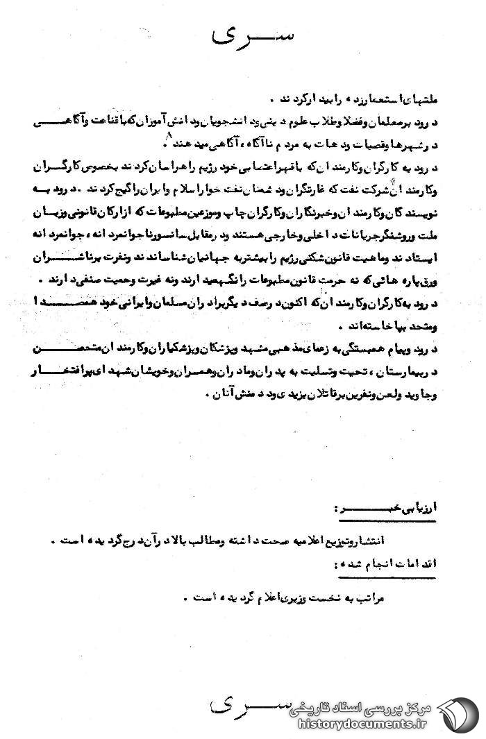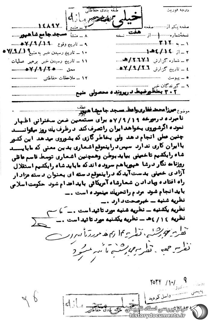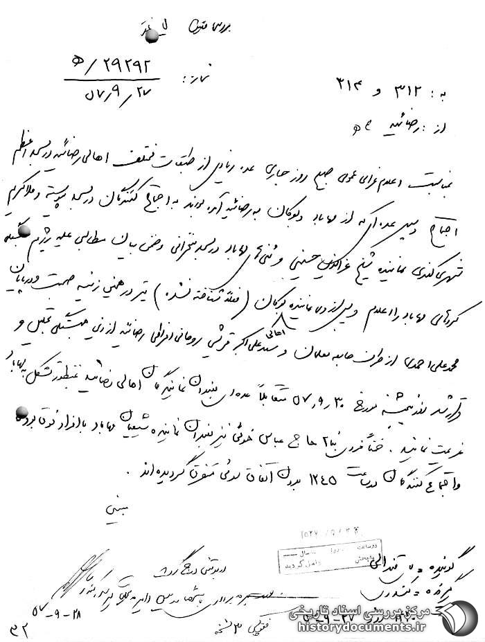 [6]. در آستانه انقلاب اسلامی (اسنادی از واپسین سالهای حکومت پهلوی)، بهکوشش جلال فرهمند، تهران، 1384، مؤسسه مطالعات تاریخ معاصر ایران، چاپ اول، ص 396-397.