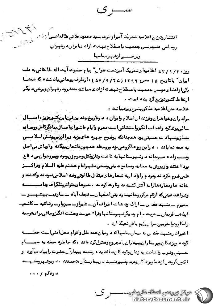 اعلامیه آیتالله سید محمود طالقانی در واکنش به حوادث برخی شهرها (30 آذر 1357). ص1