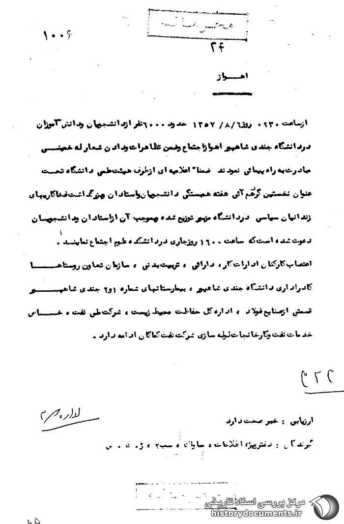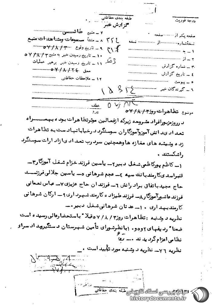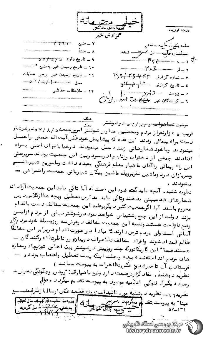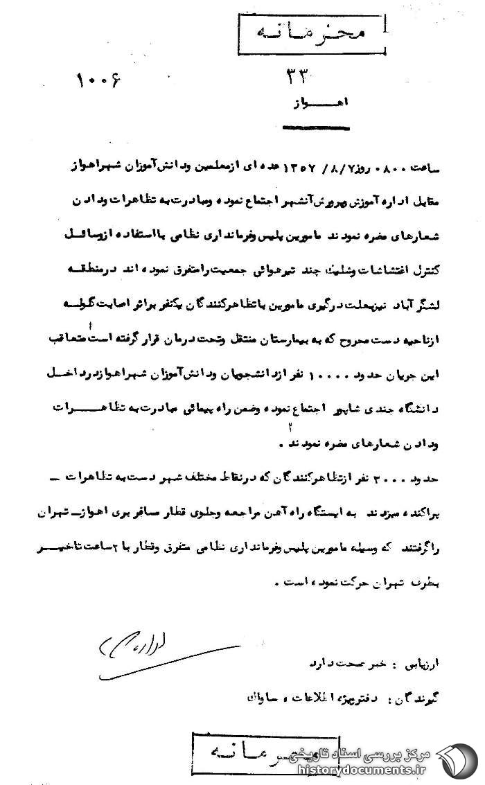 گزارش ساواک از تظاهرات دانشآموزی در شهرهای استان خوستان در روز 8 آبان 57 ص 1.