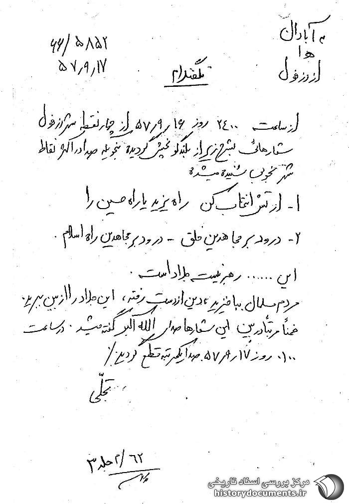پخش شعارها از بلندگوهای شهر دزفول در نیمه شب 16 آذر 57.