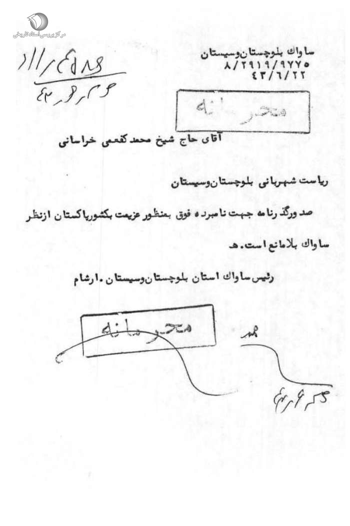 موافقت آرشام، ریاست ساواک سیستان و بلوچستان با صدور گذرنامه برای آیتالله کفعمی جهت سفر به کویته پاکستان.