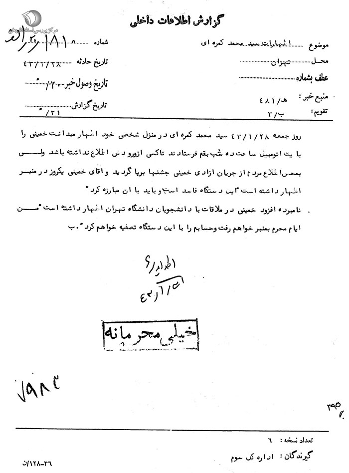 روز جمعه 28 / 1 / 43 سید محمد کمرهای در منزل شخصی خود اظهار میداشت خمینی را با یک اتومبیل ساعت ده شب به قم فرستادند تا کسی از ورودش اطلاع نداشته باشد ولی به محض اطلاع مردم از جریان آزادی جشنها برپا گردید و آقای خمینی یک روز در منبر اظهار داشته است «این دستگاه فاسد است و باید با آن مبارزه کرد»