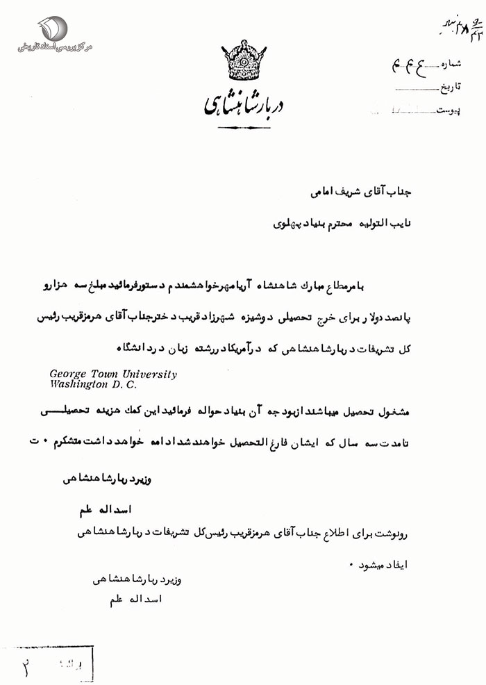 به امر مطاع مبارک شاهنشاه آریامهر خواهشمندیم دستور فرمائید مبلغ سه هزار و پانصد دولار برای خرج تحصیلی دوشیزه شهرزاد قریب دختر جناب آقای هرمز قریب[1] رئیس کل تشریفات دربار شاهنشاهی که در آمریکا در رشته زبان در دانشگاه George Town University WaShington D.C. مشغول تحصیل میباشند از بودجه آن بنیاد حواله فرمائید این کمک هزینه تحصیلی تا مدت سه سال که ایشان فارغالتحصیل خواهد شد ادامه خواهد داشت متشکرم. ت