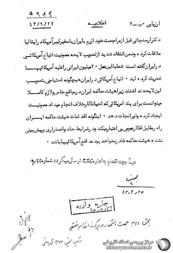 در لابلای اسناد، نکات جالبی درباره ارسنجانی به چشم میخورد که در ادامه، نمونههایی از آن از نظر میگذرد. سند نخست، دیدگاه ارسنجانی را درباره لایحه کاپیتولاسیون منعکس میکند. به اعتقاد او، نیازی به تصویب این لایحه نبود؛ چرا که دستگاه حاکمه قادر بود بدون تصویب این قانون نیز برای آمریکاییان مصونیت ایجاد کند.