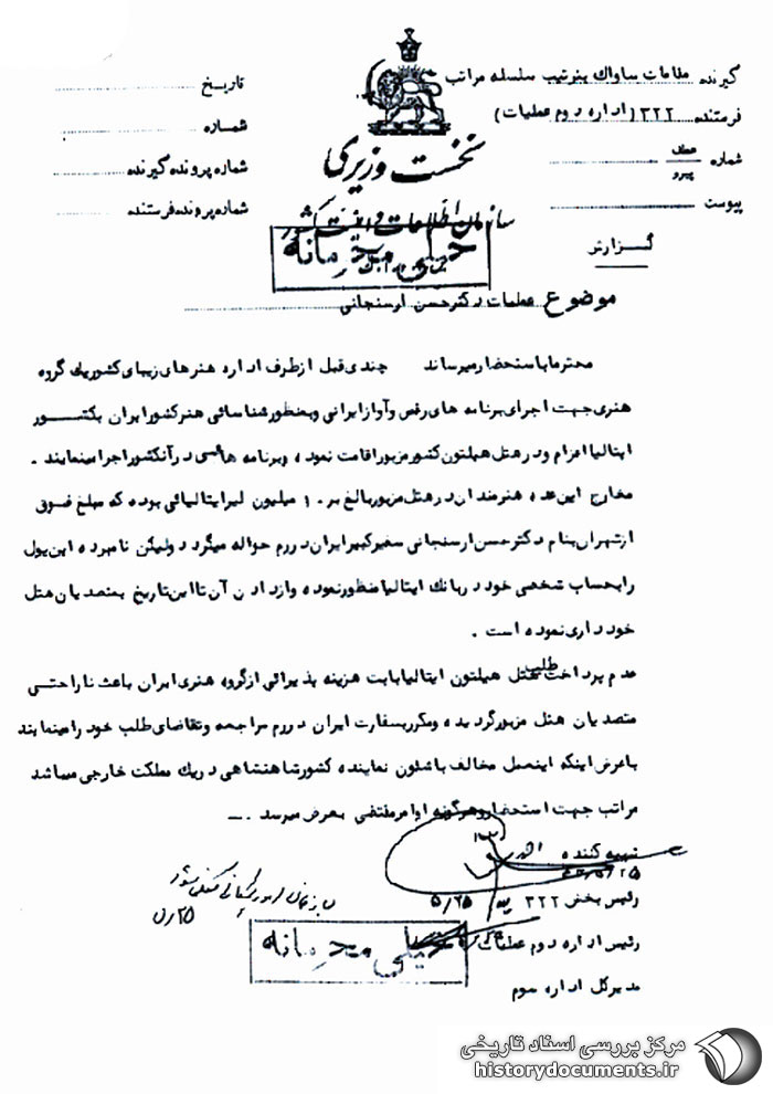 محترماً به استحضار میرساند: چندی قبل از طرف اداره هنرهای زیبای کشور، یک گروه هنری جهت اجرای برنامههای رقص و آواز ایرانی و به منظور شناسایی هنر کشور ایران، به کشور ایتالیا اعزام و در هتل هیلتون کشور مزبور اقامت نموده و برنامههایی در آن کشور اجرا مینمایند. مخارج این عده هنرمندان در هتل مزبور بالغ بر 10 میلیون لیر ایتالیایی بوده که مبلغ فوق از تهران، به نام دکتر حسن ارسنجانی سفیرکبیر ایران در رم حواله میگردد؛ ولیکن نامبرده این پول را به حساب شخصی خود در بانک ایتالیا منظور نموده و از دادن آن تا این تاریخ به متصدیان هتل خودداری نموده است. عدم پرداخت طلب هتل هیلتون ایتالیا بابت هزینه پذیرایی از گروه هنری ایران، باعث ناراحتی متصدیان هتل مزبور گردیده و مکرر به سفارت ایران در رم مراجعه و تقاضای طلب خود را مینمایند. با عرض اینکه این عمل مخالف با شئون نماینده کشور شاهنشاهی در یک مملکت خارجی میباشد، مراتب جهت استحضار و هرگونه اوامر مقتضی به عرض میرسد.»[68]