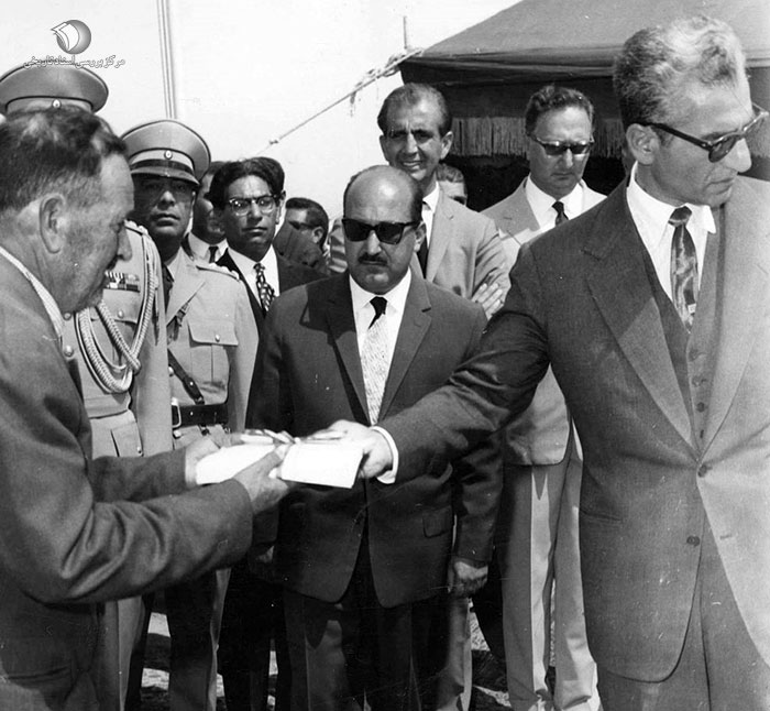 اعطای اسناد اصلاحات ارضی به کشاورزان توسط محمدرضا پهلوی (ارسنجانی نیز در عکس دیده میشود)