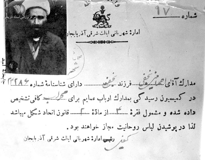 «ایشان تا 20 سالگی به کسوت روحانیت ملبس نبودند و پس از اتمام دوره مقدماتی و سطوح وارد مرحله درس خارج میگردند. چون 4 یا 5 سال از مسافرتشان گذشته بود، پدر و مادر اشتیاق زیادی برای دیدارشان داشتند، به ایشان نامه مینویسند که: «بیایید، تبریز ما شما را ببینیم و مجدداً برگردید.» ایشان به تبریز میآیند و برای دید و بازدید در منزل نشسته بودند، یکی از اساتید ایشان به نام حاج میرزا محمود دوزدوزانی که از علما و مدرسین درجه یک تبریز بودند، برای دیدار مرحوم علامه امینی میآید و به ایشان پیشنهاد میکند اکنون که شما به مدارج بالای علمی رسیدهاید، خوب است از عمامه و عبا استفاده نموده و به کسوت روحانیت درآیید. مرحوم دوزدوزانی در همان مجلس عمامهای تهیه میکنند و مرحوم علامه امینی به کسوت روحانیت ملبس میشوند.»[7]