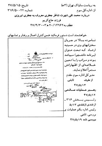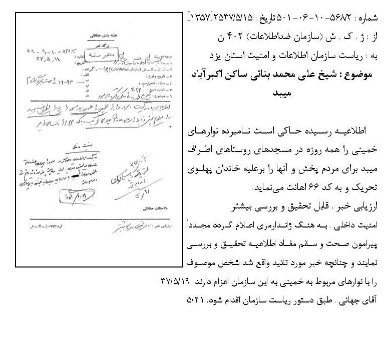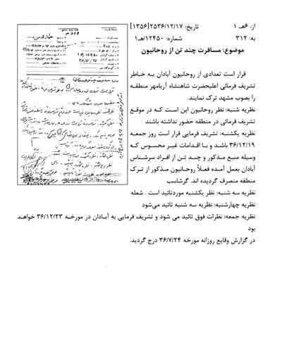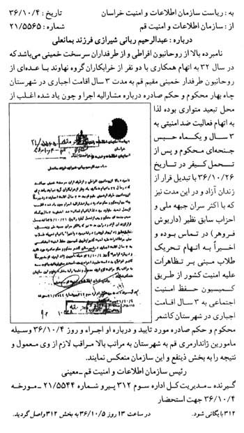 سندی که در ادامه می آید گزارشی است از فعالیتهای «آیتالله عبدالرحیم ربانی شیرازی» که به وسیلهی ساواک در سال 1356 تهیه شده است. بر اساس این گزارش آیتالله ربانی بارها تبعید و دستگیر شده است. ایشان 3 سال را در چابهار تبعید بوده و در سال 1356 نیز به مدت سه سال به کاشمر تبعید شده است.